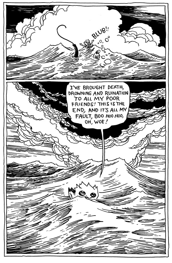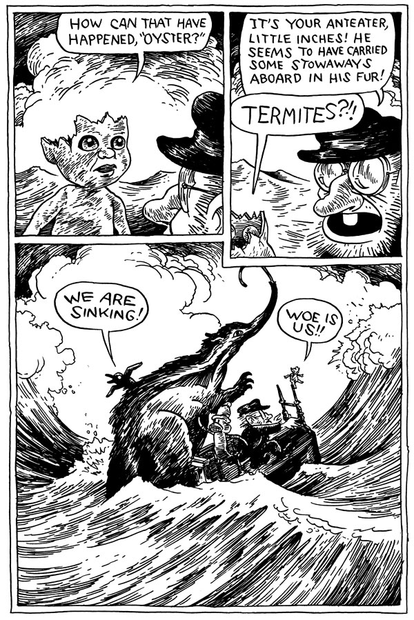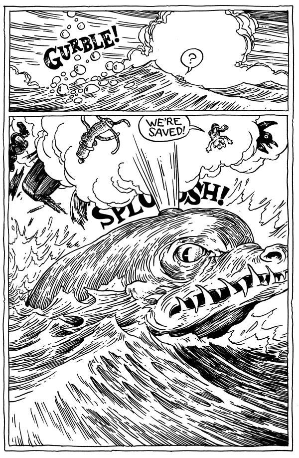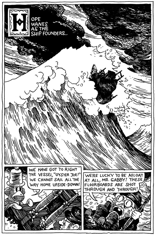 Sock Monkey and his pals sail home in the sea-worthy piano. The captain takes the Sock Monkey into his confidence as they inspect the hold. They are taking on water and in danger of foundering, and the captain suspects one of the passengers of being responsible for the impending disaster. Great high jinks on the high seas!
