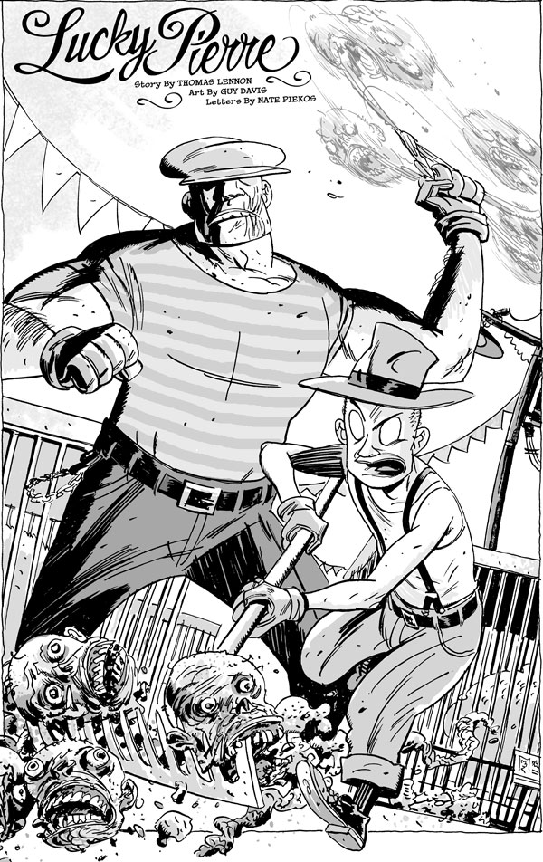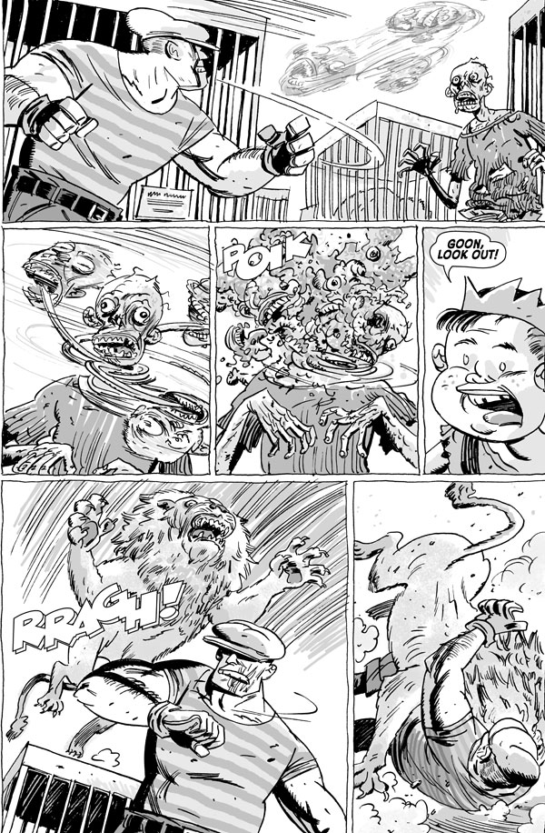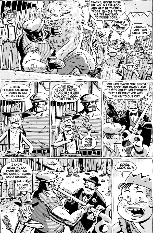 The issue begins with the return of Powell's pal, co-creator of the Comedy Central hit show Reno: 911! Thomas Lennon to the comics scene, teamed up with B.P.R.D. artist-extraordinaire Guy Davis! Further stories come from Arvid Nelson, creator of Dark Horse's newest horror title Rex Mundi, along side Humberto Ramos, hot off the heels of his debut on Marvel's Wolverine and co-creator of the Dark Horse miniseries Revelations; as well as a very special appearance by British indie artist Roger Langridge, creator of the critically acclaimed Fred the Clown! And as a special bonus, Dark Horse's own intrepid editor Scott Allie also brings to life his own little corner of The Goon universe with the help of Jefferson Street Studio-mate Todd Herman, as they examine the life of one of the book's most underrated heroes, Willy Nagel.