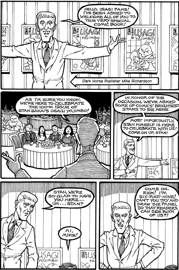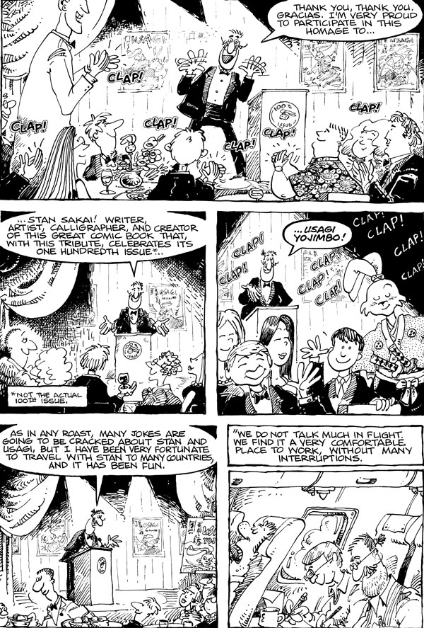 Featuring eight extra story pages for a total of thirty-two, Usagi Yojimbo #100 is structured as a good-natured roast of both Usagi and Stan, kicking off with an opening by publisher Mike Richardson and artist Rick Geary before launching into unforgettable contributions from Frank Miller, Jeff Smith, Sergio Aragonés, Guy Davis, Mark Evanier, Scott Shaw, Jamie S. Rich, and Andi Watson—not to mention Stan Sakai himself!