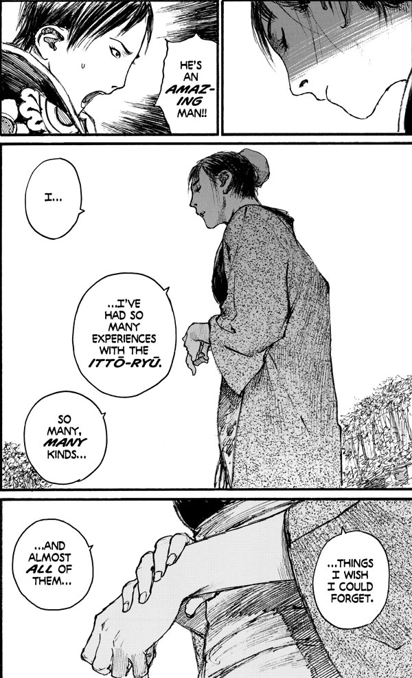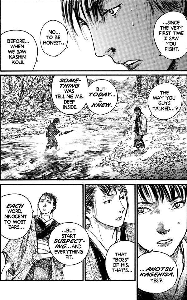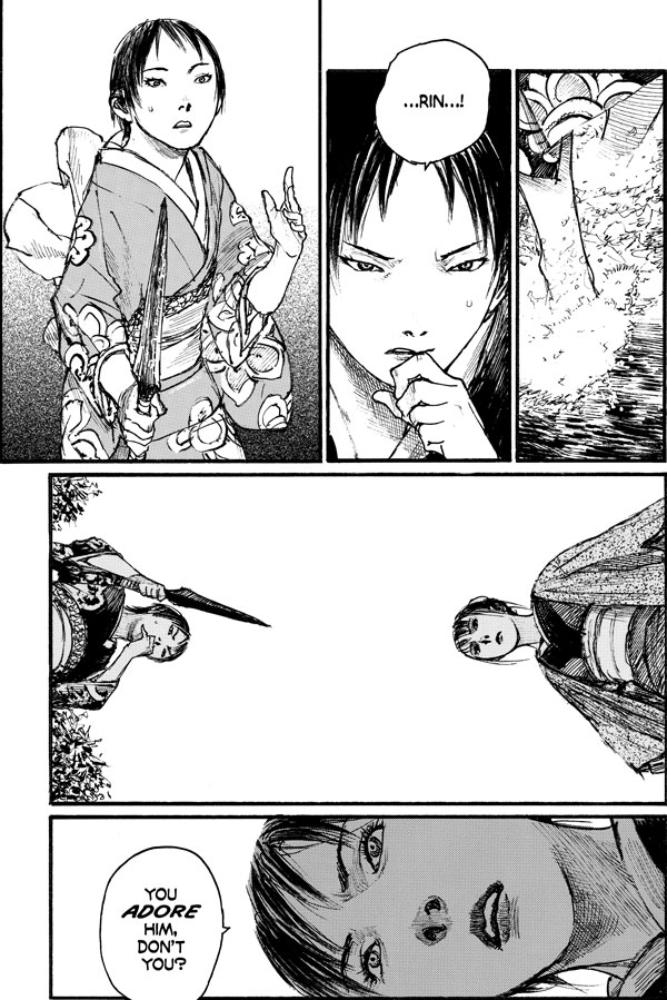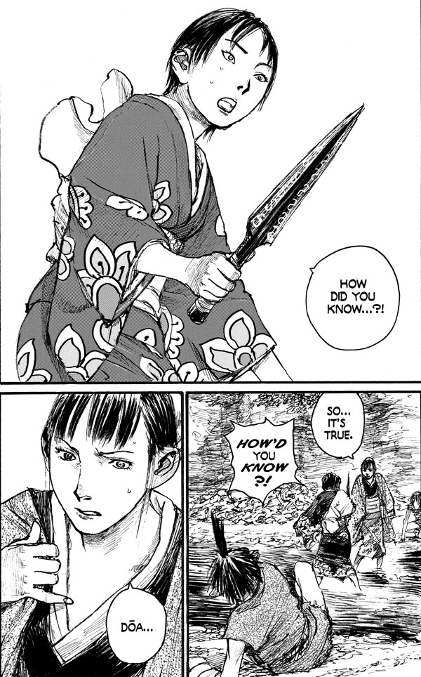 Döa and Rin finally realize that they have something very strange in common! They begin a heated exchange over the existence of the murderous Ittô-ryû sword school before being interrupted by a clue that literally begs for their attention. Sounds odd? It is . . . and we won't be giving anything away here! As Döa and Rin come across a huge, horrific breakthrough in their quest to find Isaku and Manji, crazy Doc Burando revels in his newfound power. Imprisoned in an underground torture chamber deep below Edo Castle, Manji doesn't know what's worse, having his mystical bloodworms and healing powers tested every day or--as a "captive audience"--having to listen to Burando's insane rants on modern medicine and immortality. Enjoy an episode of discoveries and heartache, as Samura's two powerhouse heroines reach a major turning point that will change their relationship forever!