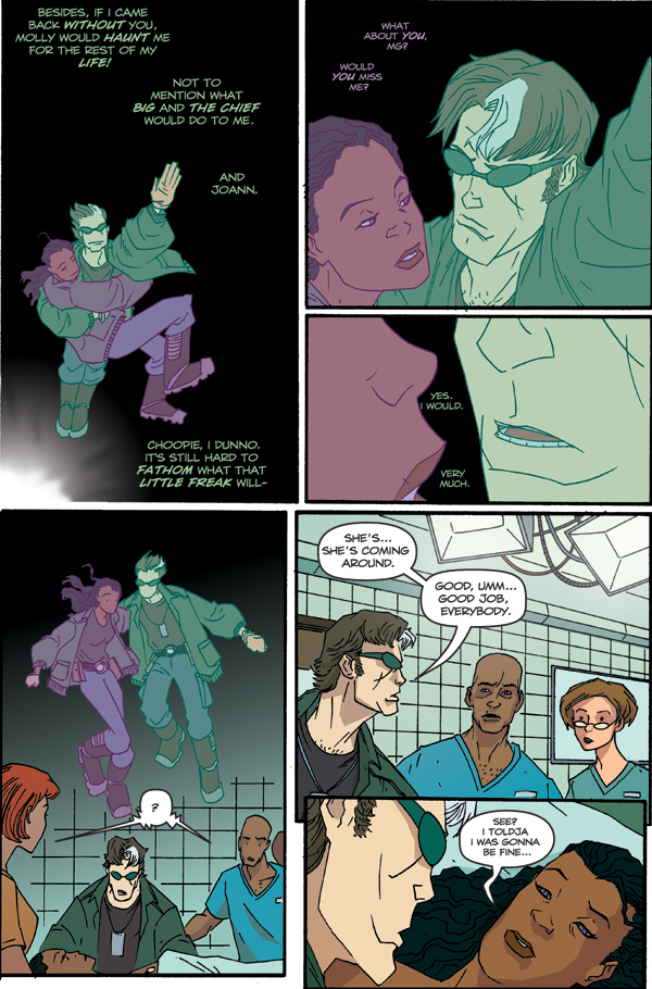 Big wakes up in the shower only to find out that the past three issues were all a dream! While on vacation in Las Vegas, Molly and MG accidentally get married by an ordained Elvis. And Choopie becomes attached to a stray dog only to be heartbroken when the owner arrives to claim him. Choopie and the little boy argue over who loves the pooch more, but eventually Choopie does (almost) the right thing and returns the little dog to the boy. . . sans blood.