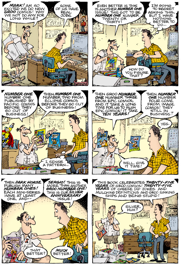 Celebrate twenty-five years of the world's stupidest barbarian doing stupid and barbaric things! After a brief hiatus, the Champion of Cheese Dip is back to battle the menace of "The Plague," an all-new story by the same guys responsible for all the Groo stories for the last quarter-century, Sergio Aragones and Mark Evanier. Also, thrill to The Groo Alphabet, a primer of that hero's friends and foes (mostly foes), followed by a special illustrated text story by Sergio and Mark on how this comic came to be and why it just won't go away. Plus other silly features.