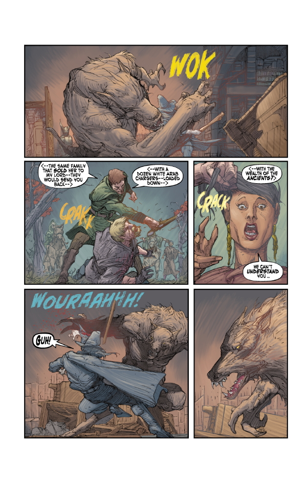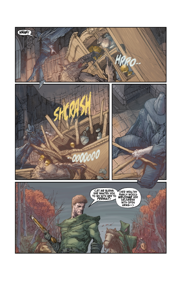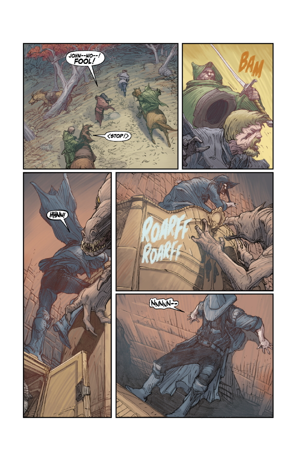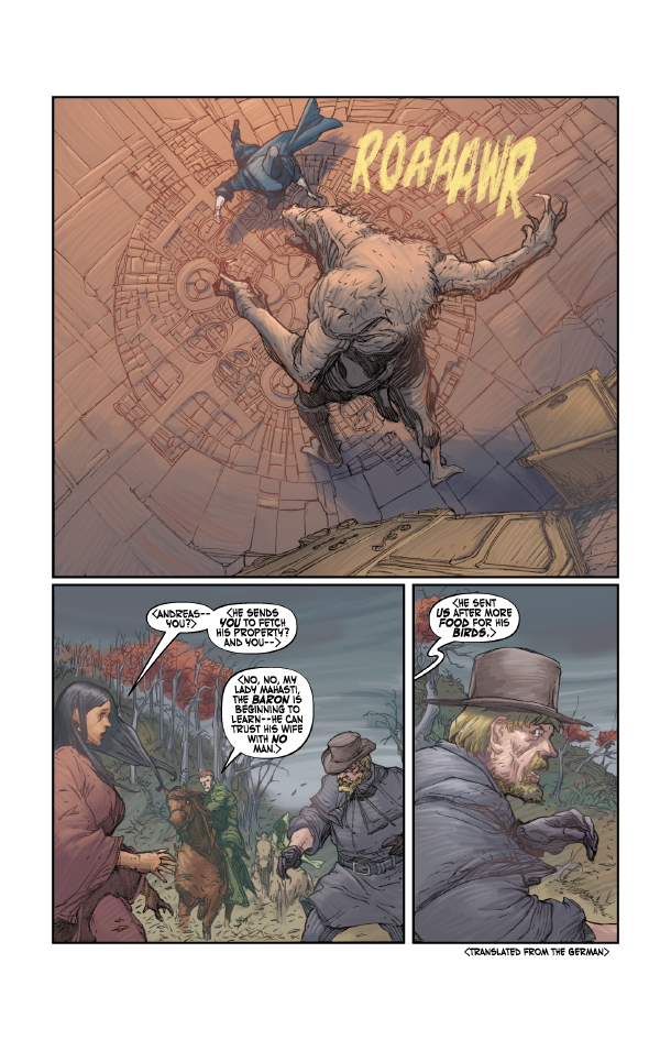 An action-filled frenzy! With his host wounded--and bodies piling up in both the Black Forest and the Castle of the Devil--Solomon Kane tries to keep himself and his deceptively simple companion, John Silent, from quick deaths on the gallows. The lovely, scheming Mahasti is missing, supernatural horrors lurk in the forest, and Baron von Staler becomes a bit unhinged. Expanding upon Robert E. Howard's unfinished "Castle of the Devil" story, writer Scott Allie (Devil's Footprints, Star Wars: Empire), newcomer Mario Guevara (The Lone Ranger and Tonto), and coloring visionary Dave Stewart (Umbrella Academy, Hellboy) deliver a compelling, horror-filled adventure that is faithful to Howard's original Solomon Kane work.