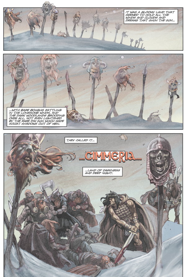 Conan the Cimmerian #0 marks a transitional period in young Conan's life, as he spurns the magicians, turncoats, and legal trappings of the cities he's seen in order to return to the beloved northern frontiers of Cimmeria, where he was born and raised. It also marks a turning point in the artistic muscle that will fuel Conan's adventures throughout 2008 and beyond. Writer Timothy Truman and Argentine artist Tomás Giorello are joined by renowned colorist José Villarrubia in this special issue, as they deliver their adaptation of Robert E. Howard's "Cimmeria" poem. And what's up with Conan? He fights for his life when he crosses paths with a pack of Vanir raiders on the Cimmerian border!