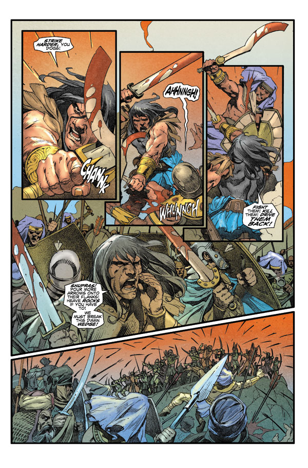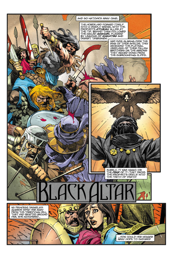 In "Black Altar," the relentless final chapter in the "Black Colossus" adaptation, Natohk's desert hordes surge up the narrow Shamla Pass, and Conan's ragged army desperately attempts to hold their high ground. Outnumbered and facing an army fueled by a zealous, reborn Stygian wizard, simply surviving may be the greatest victory Conan can hope for. Any triumph will ring hollow, though, if Conan can't protect Khoraja's current sovereign, the beautiful Princess Yasmela -- whom Natohk has vowed to capture! Tim Truman, Tomás Giorello, and José Villarrubia bring the gripping, blood-filled Battle of Shamla Pass to life! Smartly written and flawlessly rendered, don't miss the epic finale to a Robert E. Howard classic.