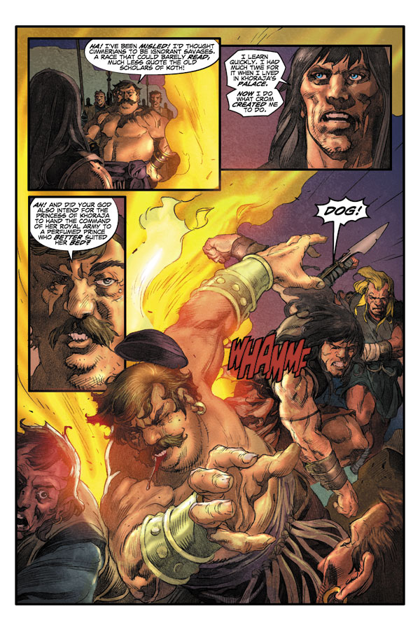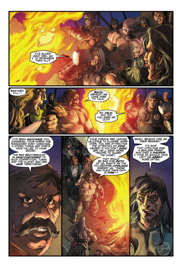 In part two of "Kozaki," both Sergius the pirate and the sadistic Shah Amurath decide to confront Conan's group of bandits, who are encroaching upon their territories and threatening the outlying granaries, farms, and villages of the proud country of Turan. King Yildiz quickly orders the Shah to annihilate all Kozaki riders, and Sergius arranges a parley with our favorite Cimmerian. In a tense meeting, Sergius explains how commerce works around the Vilayet Sea and offers that their two imposing forces work together against the Shah. With those in Conan's hungry crew growing wild and impatient, Conan's not even sure how long he can keep his own men together -- but he'll slit the throat of any who try to defect!