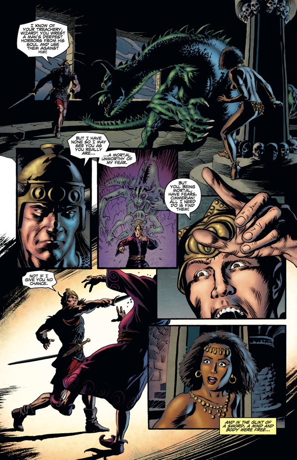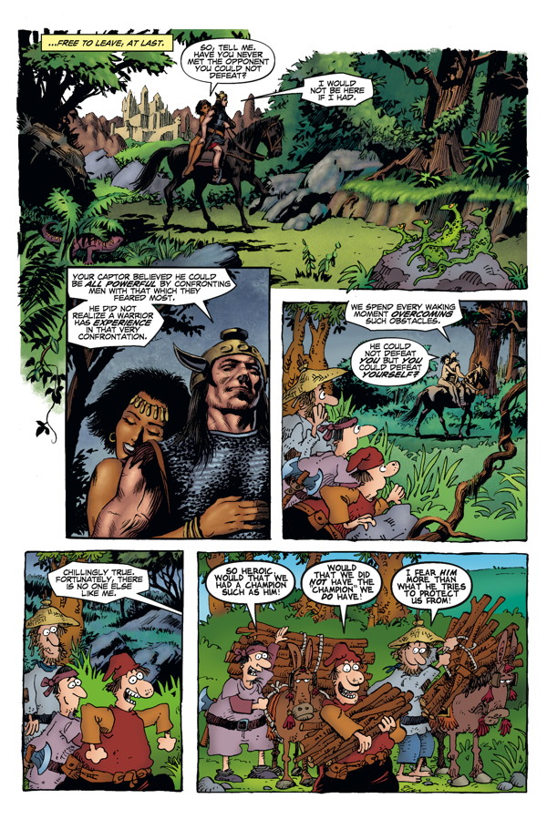 It had to happen: The most heroic warrior in history meets the stupidest as Robert E. Howard’s immortal Conan the Barbarian crosses swords with Sergio Aragonés’s Groo the Wanderer in Groo vs. Conan #1. This four-issue miniseries was concocted by Mark Evanier and Sergio Aragonés, aided by illustrator Thomas Yeates and colorist Tom Luth. Will Conan annihilate Groo? Will Groo turn out to be the man who can defeat Conan? We’ll see.