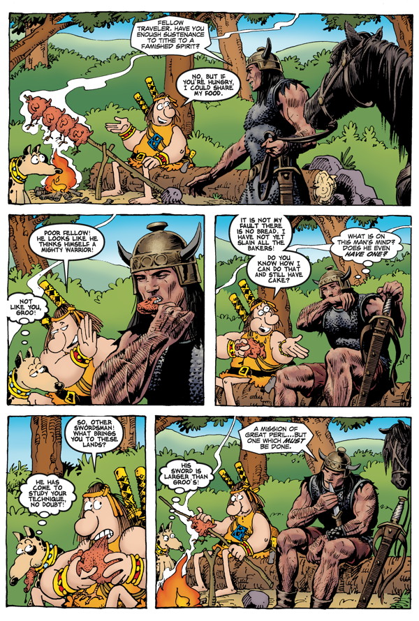 Eisner Award winners Mark Evanier and Sergio Aragonés team with the incomparable Thomas Yeates for a crossover thousands of years in the making. Groo vs. Conan pits the two most feared barbarians in comics against one another. Will the savagery of Conan overwhelm the stupidity of Groo, or will Groo’s unmatched aptitude for destruction catch the Cimmerian swordsman off guard?