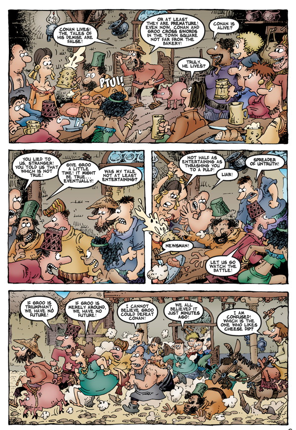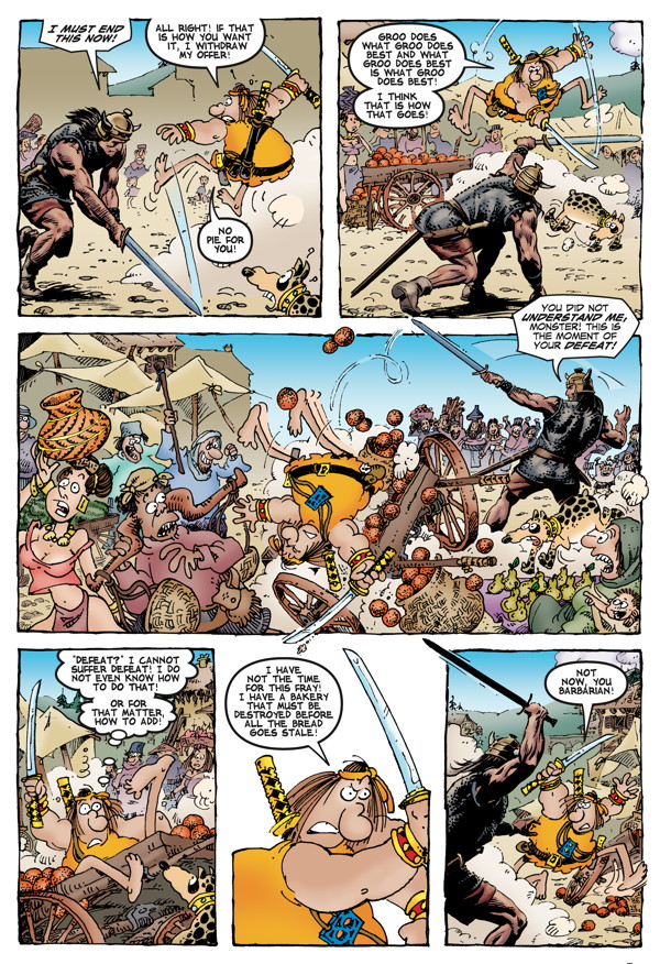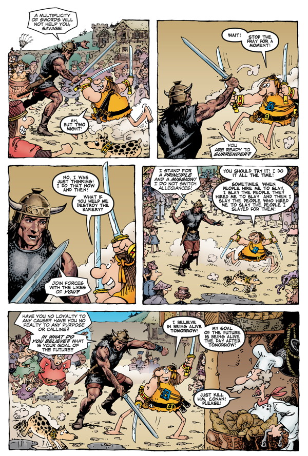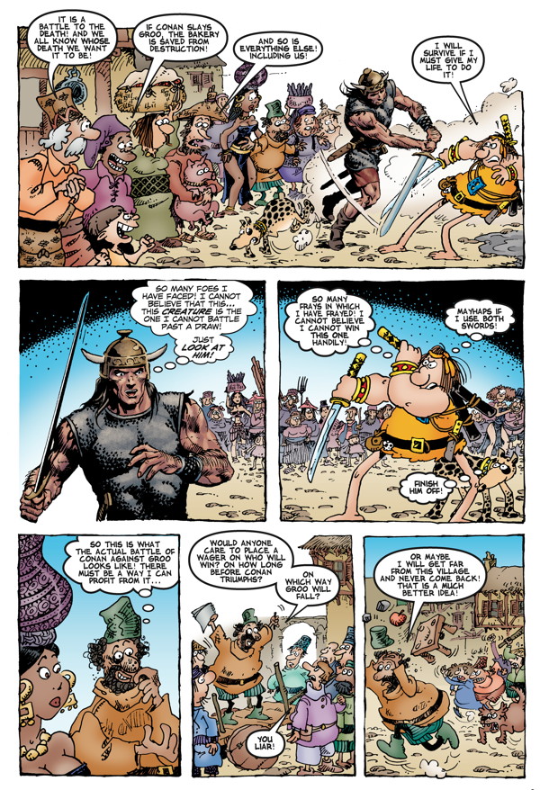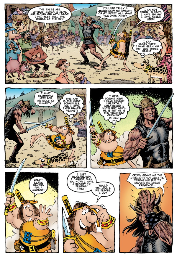 The final showdown between the world’s greatest warrior and comics’ biggest idiot! Conan fights for his kingdom, Groo fights for his bakery, and Sergio and Mark fight for their comic shop . . . Triple story lines collide in a chaotic climax of barbaric proportions!