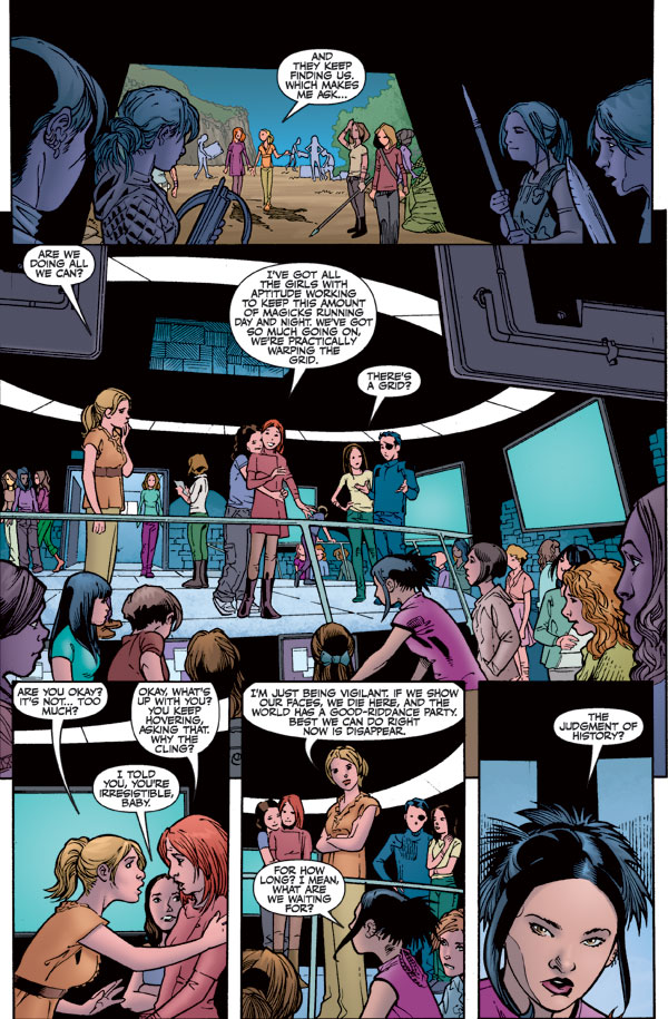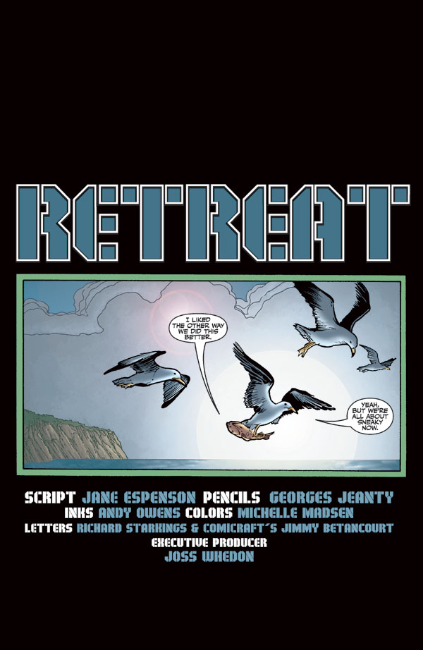 Series artist Georges Jeanty, writer Jane Espenson, and executive producer Joss Whedon present Buffy on the defensive in "Retreat."