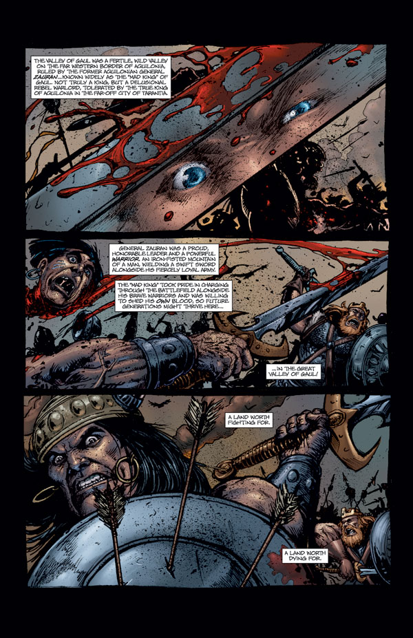 Living legend Darick Robertson (The Boys, Transmetropolitan, Wolverine) focuses his powerful storytelling talents on Conan -- his favorite barbarian hero! In this "adult fable" that Robertson writes AND draws, Conan travels away from Cimmeria to search for a mercenary job that will bring him the fierce joy of battle and the spoils of war. Intrigued by a leader known as the "Mad King of Gaul," Conan joins a band of brutes who are defending the Aquilonian border from incursions and who enjoy living in a lush valley that the Mad King claims for his own. These warriors soon believe that Conan may be a more fitting successor to their leader than the supposed king's own son -- setting Conan on a potentially disastrous course!