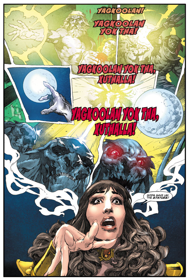 Running from the army of Turan, Conan and fellow fugitive Olivia hide out on a small island in the Vilayet Sea, but they soon find themselves stalked by a huge, unseen terror in the jungles and threatened by a group of pirates! These may be the least of their concerns, though, because the ruins of a lost civilization stir when a full moon rises over the isle--and even deadlier creatures awaken!
