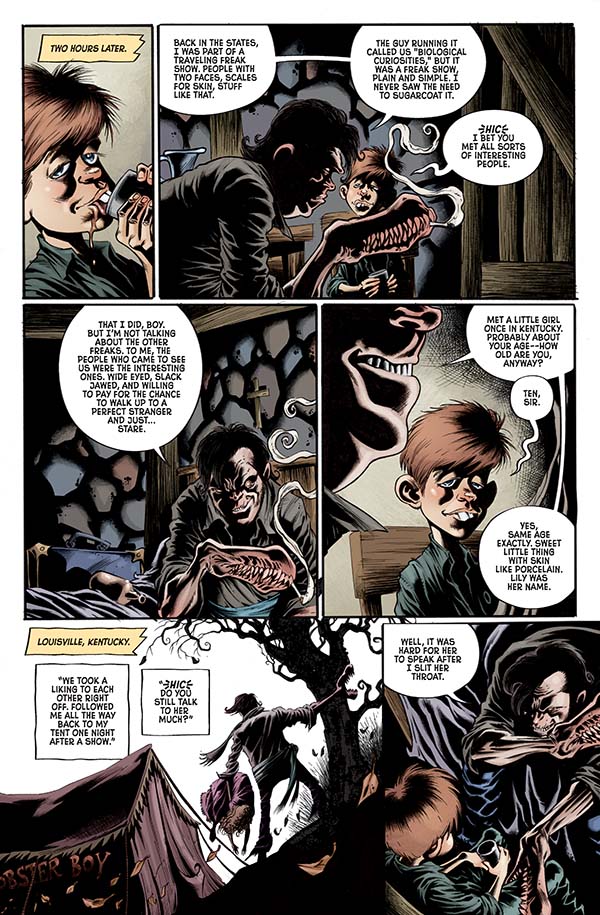 After a narrow escape, Billy and his freaky cohorts arrive at Count Dracula’s in search of their alligator man. They find a welcoming offer of food and a bed, along with a not-so-subtle warning. Will Billy and the biological curiosities fall prey to the count’s charms?