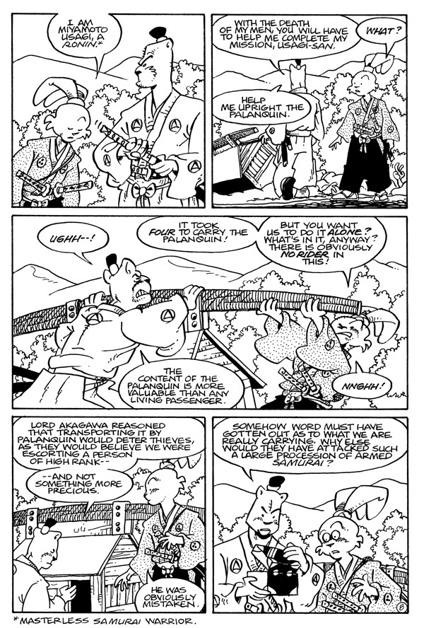 Usagi is hired to deliver a valuable stone named Distant Mountain to Lord Akakane, a practitioner of suiseki, the art of stone appreciation. But first the rabbit ronin must run a deadly gauntlet of bandits and samurai sent by a rival collector!