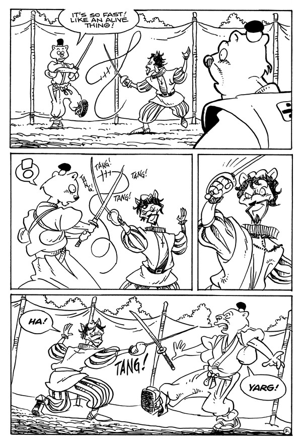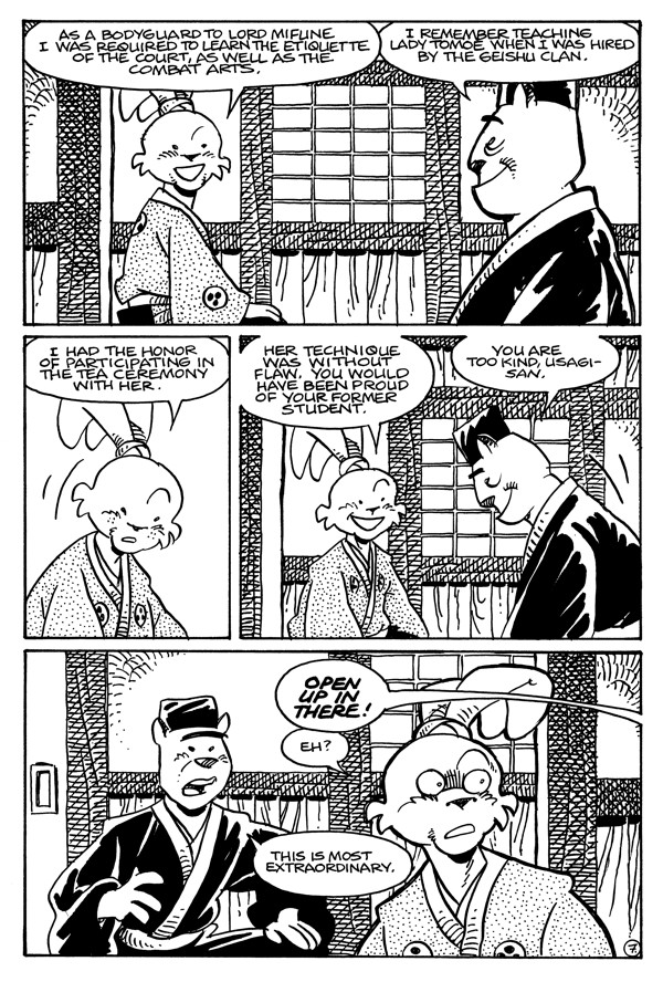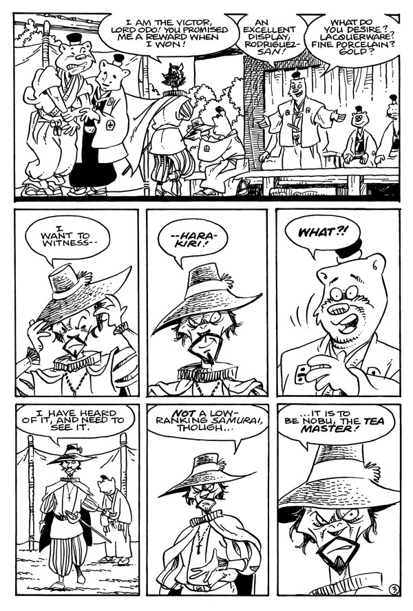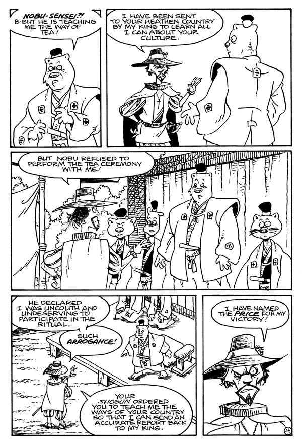 Usagi meets a European swordsman for the first time, a traveler who makes his mark by defeating Lord Odo’s best samurai! But when the stranger demands to witness a ritualized-suicide ceremony and chooses Tomoe’s old tea master as the victim, the rabbit ronin is caught between honorable tradition and compassion!