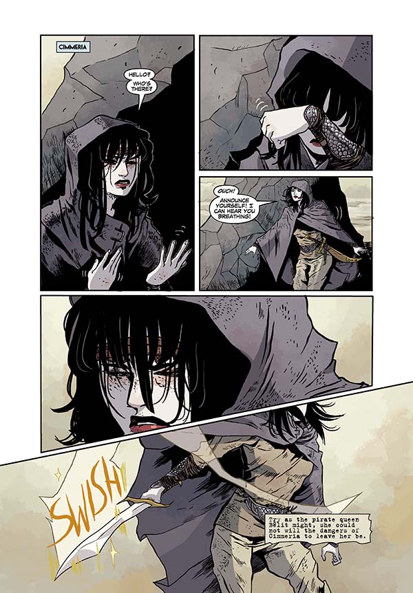 Brian Wood and Vasilis Lolos’s “Border Fury” concludes, as the secret behind Conan’s impostor is revealed! Separated on Cimmeria’s frozen plains, Conan and Bêlit each fight handicapped while facing a deadly foe—Conan by the unexpected identity of his pretender and Bêlit by debilitating snow blindness!