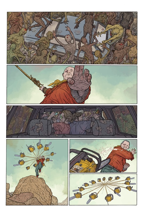 The Shaolin Cowboy returns, but nowhere in sight is there a dead Robin, any infinity gauntlets, or a single conquering Ultron—just flat-out action, intrigue, and plenty of roadkill. Geof Darrow’s slow-talkin’, kung-fu-gripping hero proves once again, in this brand-new new series, that the only thing that can stop a bad guy with a gun is a good guy with a chainsaw!
