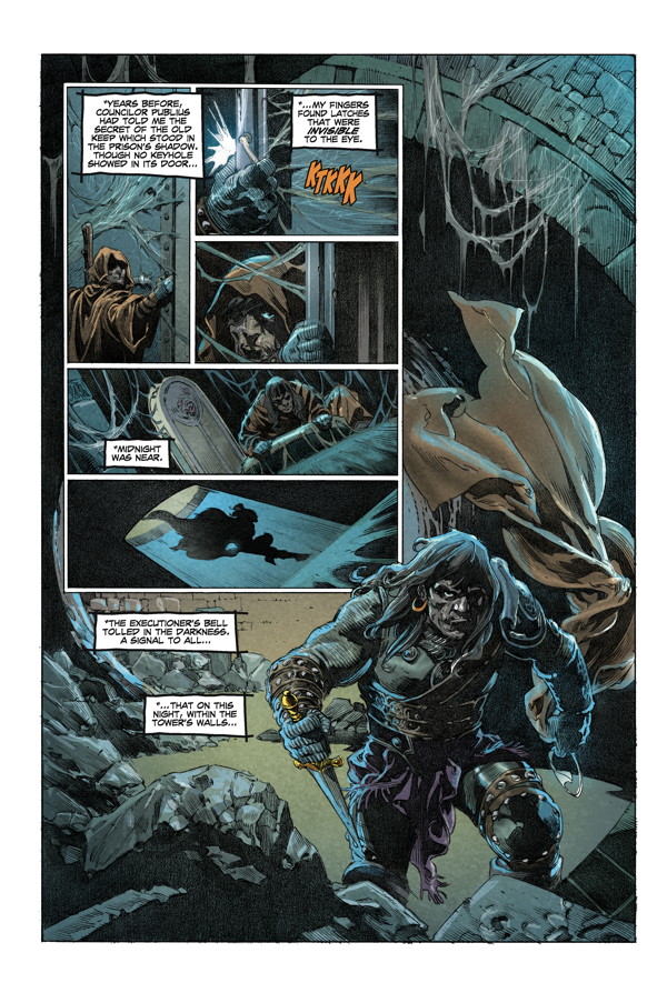 Torn from his throne and on the run, Conan sneaks into his own occupied capital city and the ominous Iron Tower to rescue an innocent child from execution! Some very unlikely loyalists come to his aid against an army of traitorous guards, but Conan’s fight to regain his crown is far from over!