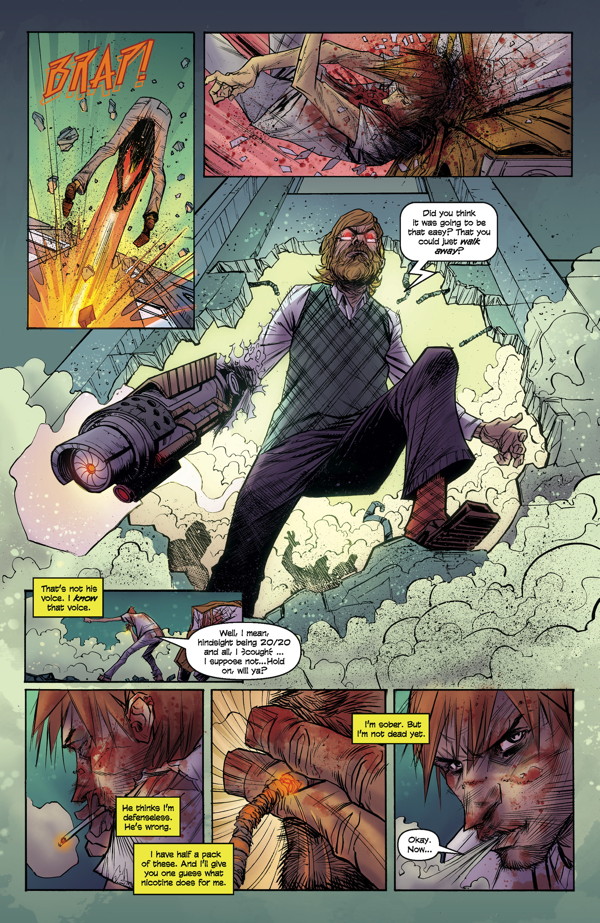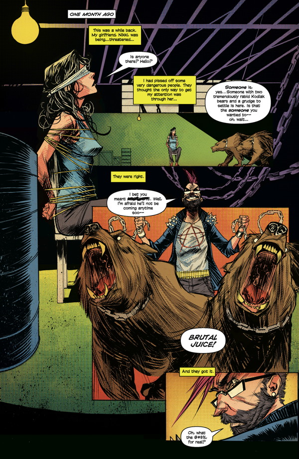 Ruben’s attempt at a twelve-step recovery stalls before it begins, as an army of supervillains, led by his old nemesis Brutal Juice, assembles against him. But the alcohol-fueled superhero won’t give up yet . . . and before this blood-soaked issue is through, one of them will recognize a HIGHER POWER.