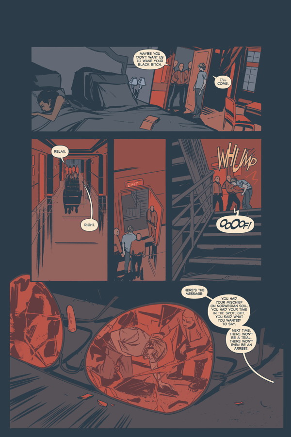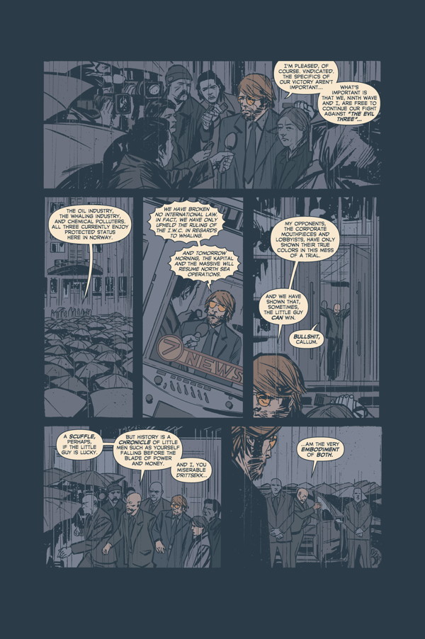 As Ninth Wave’s pre-Crash antiwhaling ideology is challenged, so is their very place in these waters, as the crew of the Kapital enters a pitched battle against traditional whalers. Meanwhile, Mary is AWOL at this most crucial time, with no indications that she’ll ever come back or any clues to where she’s gone.