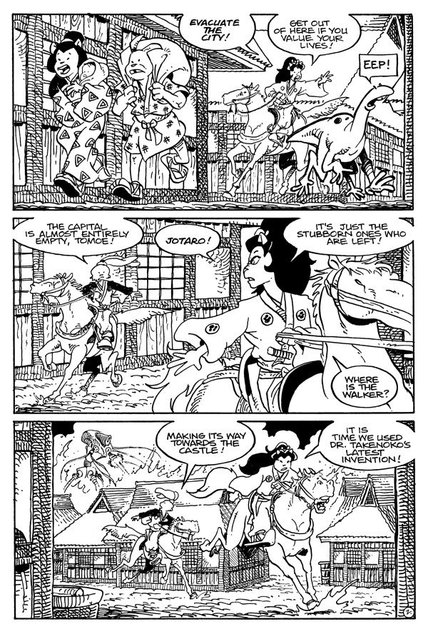 If you saw the last page of the previous issue (and if not, why didn’t you?!), you’ll know that this just might be the most eagerly anticipated Usagi comic of all time! Prepare yourself for the final, titanic battle to decide the fate of Usagi’s world! You will surely cry, but will they be tears of sorrow, of joy . . . or both?