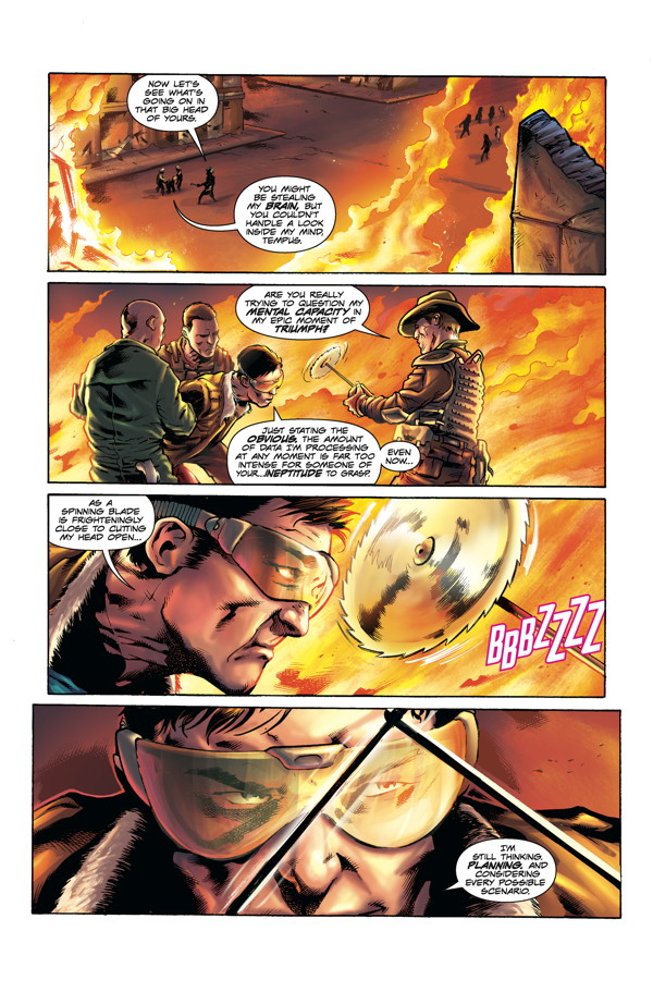 The tech-obsessed madman Tempus has set fire to Captain Midnight’s local community and captured the hero, and now he’s about to pick his brain . . . literally! As the buildings burn and the buzz saw roars, can Captain Midnight save the day and mend his mind by being the hero and the man the people need?