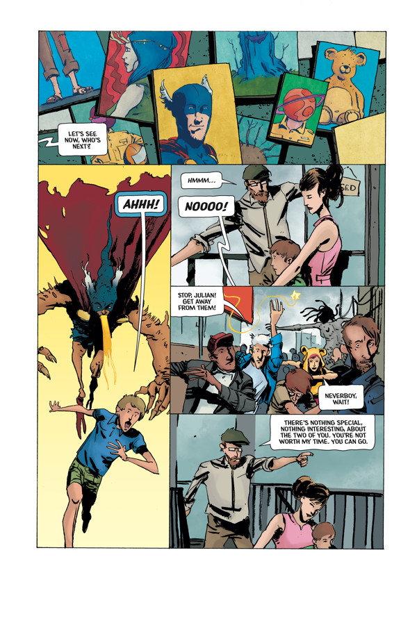 The world of imagination is collapsing in on itself, and Neverboy’s wife and son are caught in the chaos. The dream must stop the dreamer before all is lost.