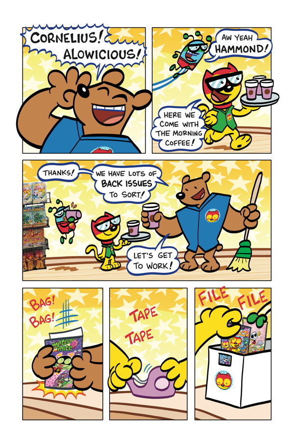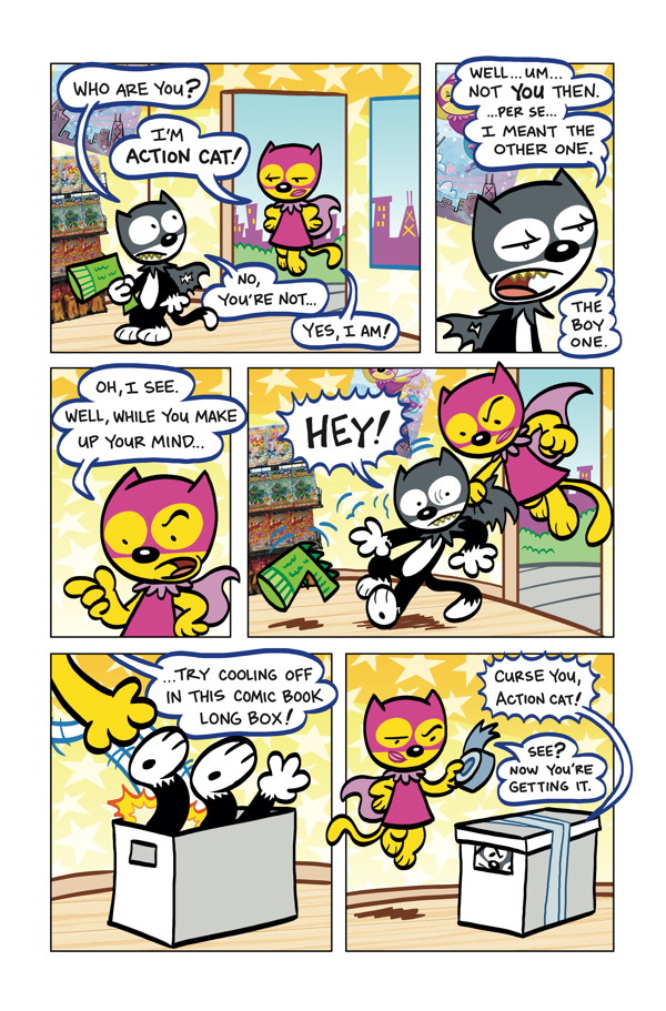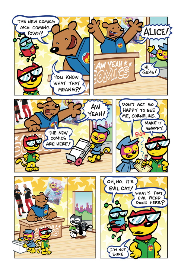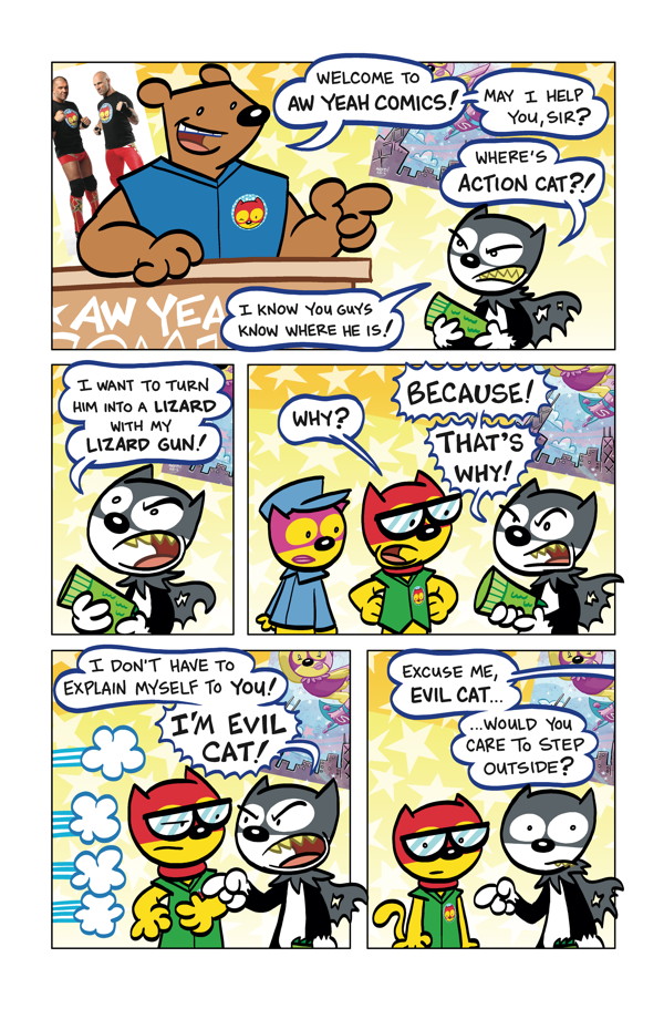Fresh from the creative minds at Aw Yeah Comics—a brand-new series starring the valiant Action Cat and his trusty sidekick, Adventure Bug! As Evil Cat lurks behind the scenes, our heroes endeavor to bring comics to the good people of Beautiful Downtown Skokie. You better believe high jinks will ensue!