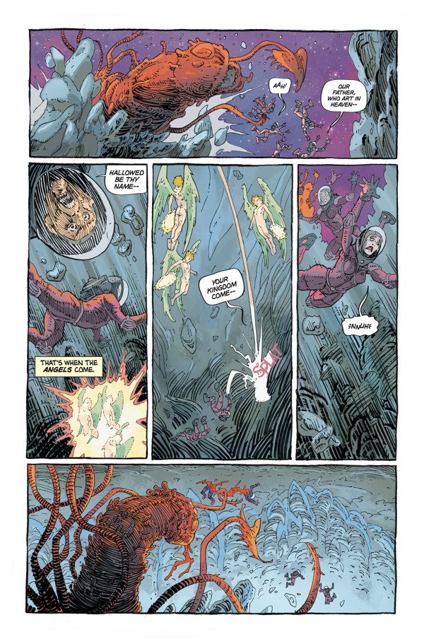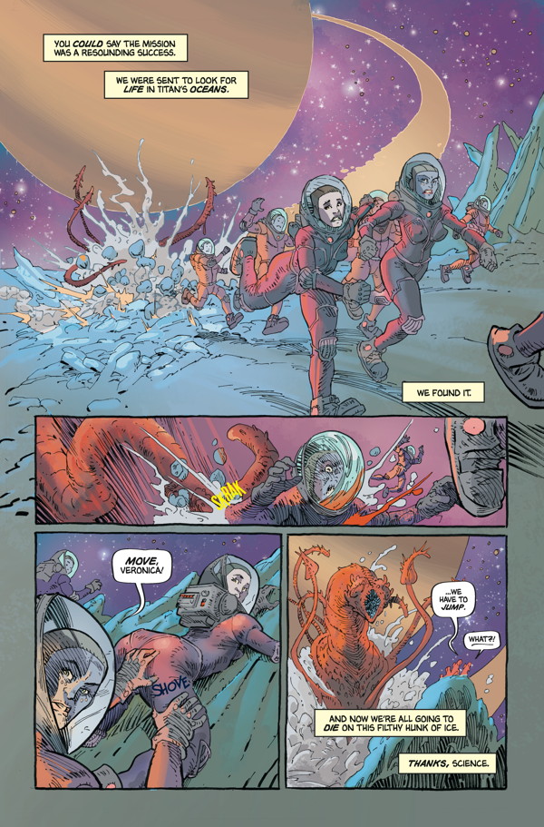 Grindhouse’s final arc is guaranteed to get your green blood running hot! Plucked from the tentacles of doom by angels, Veronica and Britt find a new home on a spaceship that runs on a very special, very hot and sweaty energy. “Nebulina” is ready to launch, and we’ve got three words for you: Sex! In! Space!