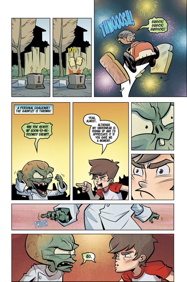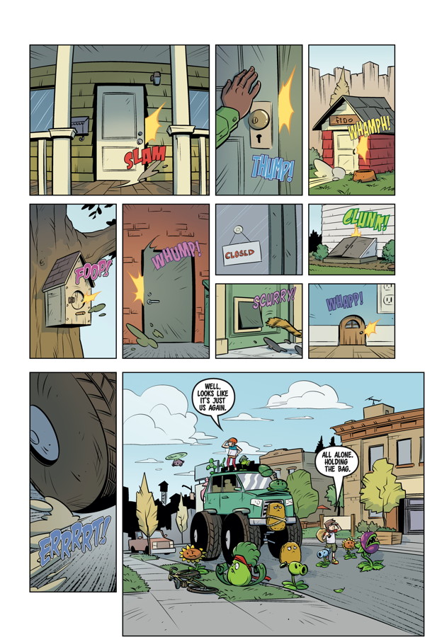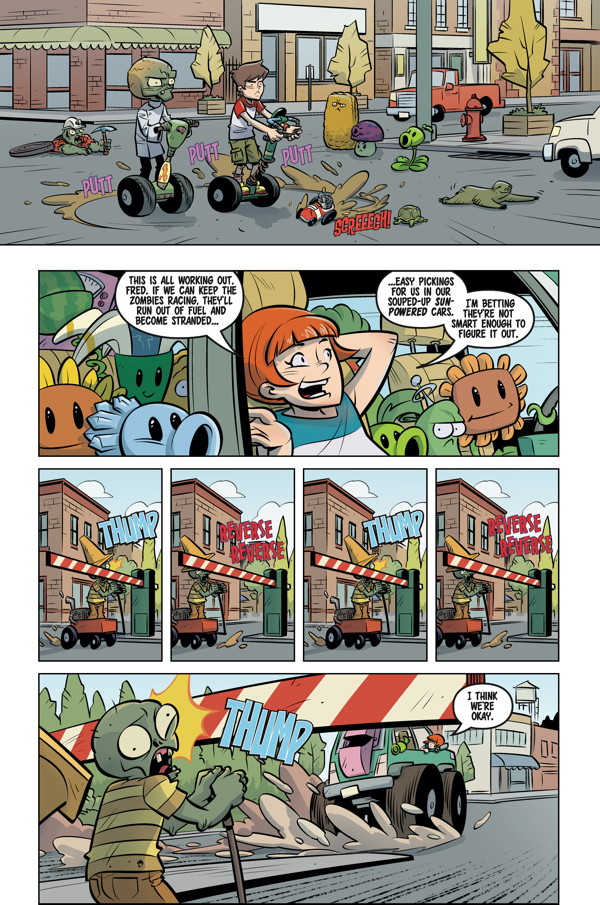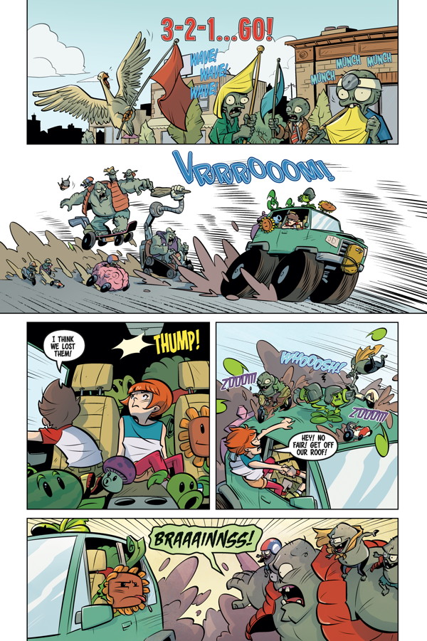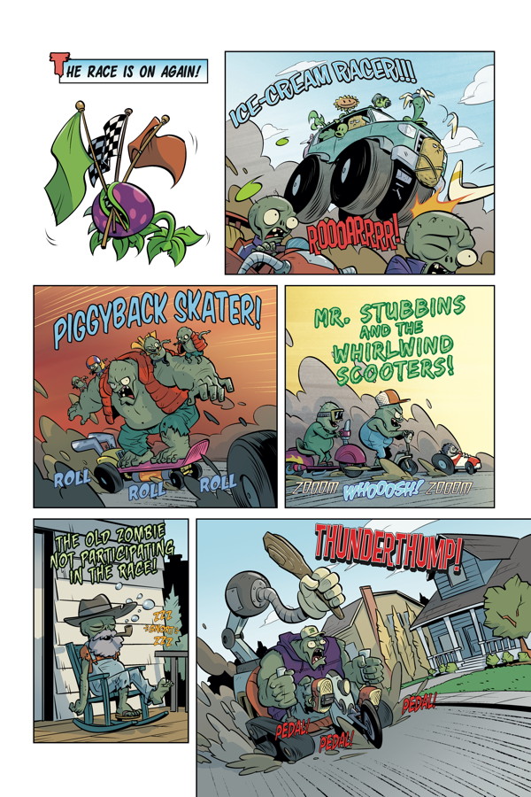 Dr. Zomboss unleashes a horde of mobile, fast-moving zombies on the innocent citizens of Neighborville! Riding inventive hot rods and crazy contraptions, both zombie and plant forces alike pull out all the creative stops in a series of contests to win control over the city! A competitive, race-filled finale as our Petal to the Metal story arc closes!