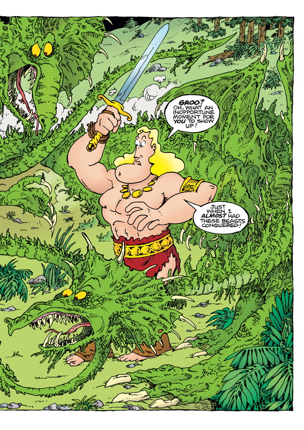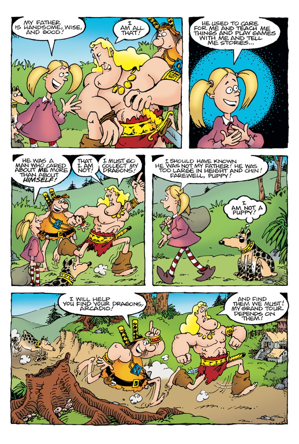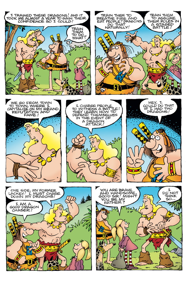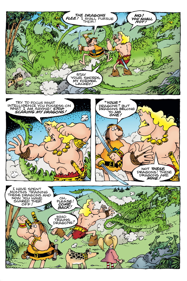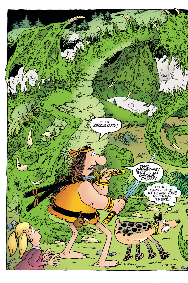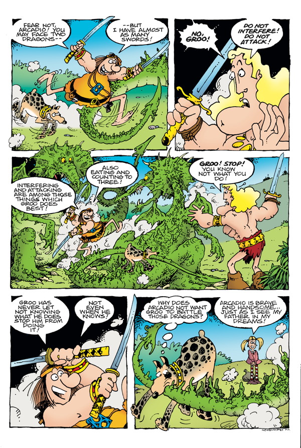 The Year of Groo marches on, as Groo marches right into Arcadio the Hero. Arcadio’s in the protection business, teaching villagers how to protect themselves from dragons . . . but he should be teaching them to protect themselves from Groo! Feather-brained barbarian thrills from the award-winning team of Sergio Aragonés and Mark Evanier, with Stan Sakai and Tom Luth.