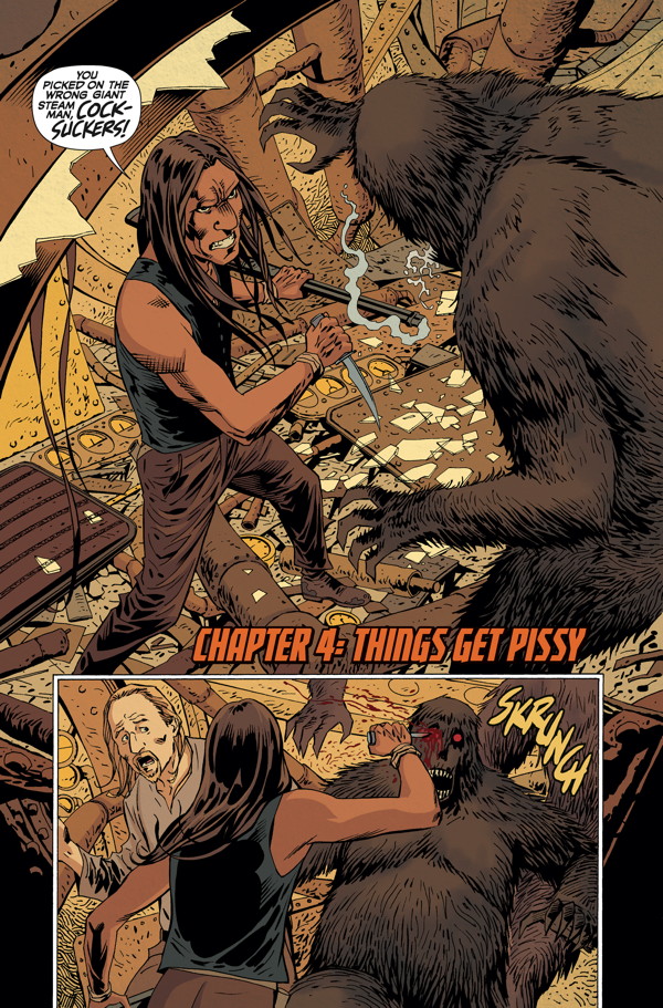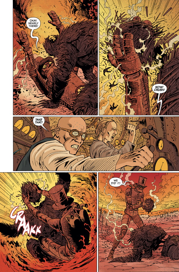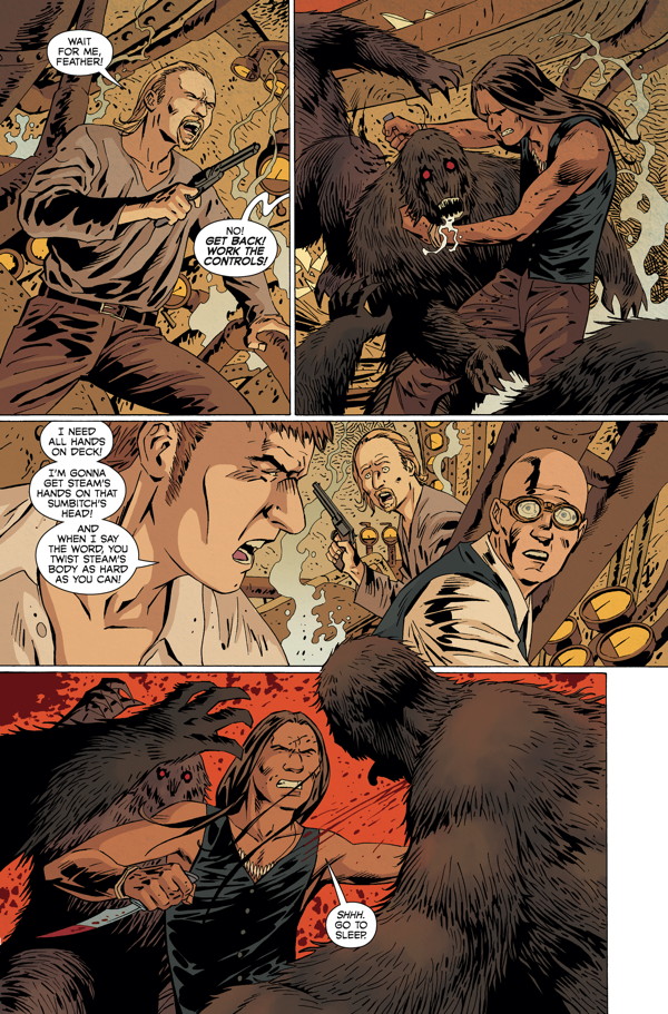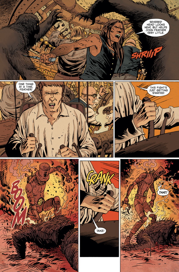 The battle between the Steam Man and the Dark Rider approaches its devastating climax! Swarmed by vicious Morlocks, the crew of the Steam Man must engage in brutal hand-to-hand combat, but their wiles and wits may not be up to the task of defeating the Dark Rider’s rabid thralls!