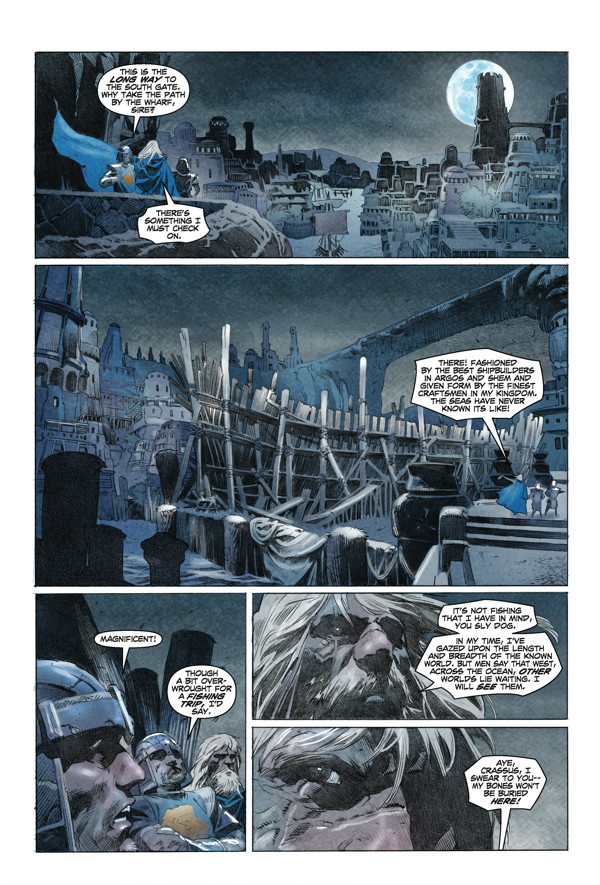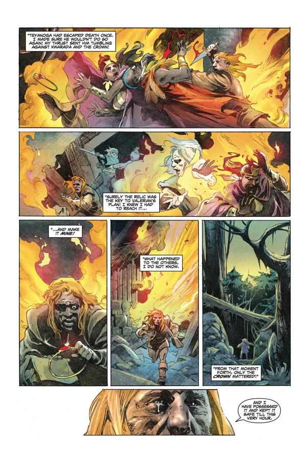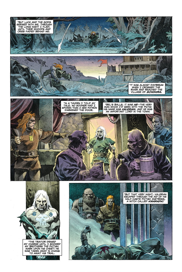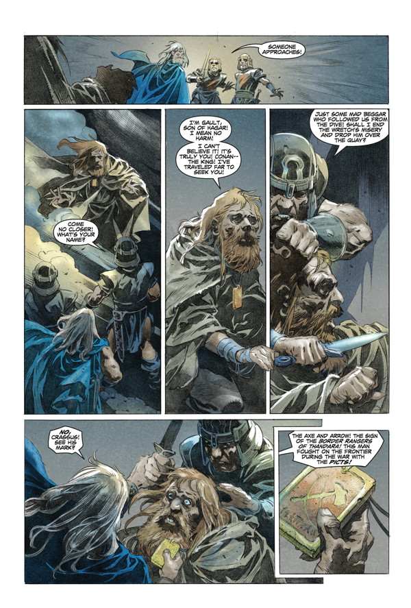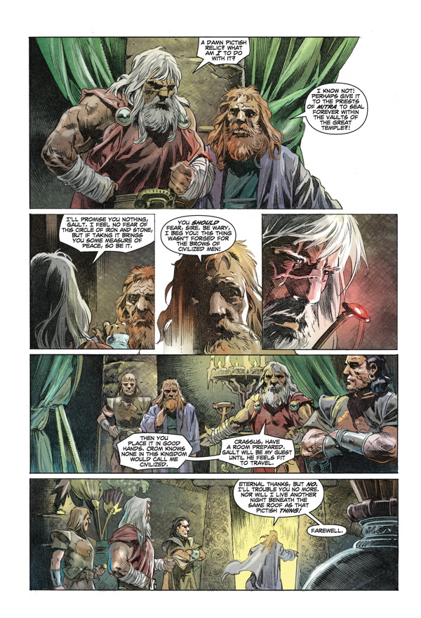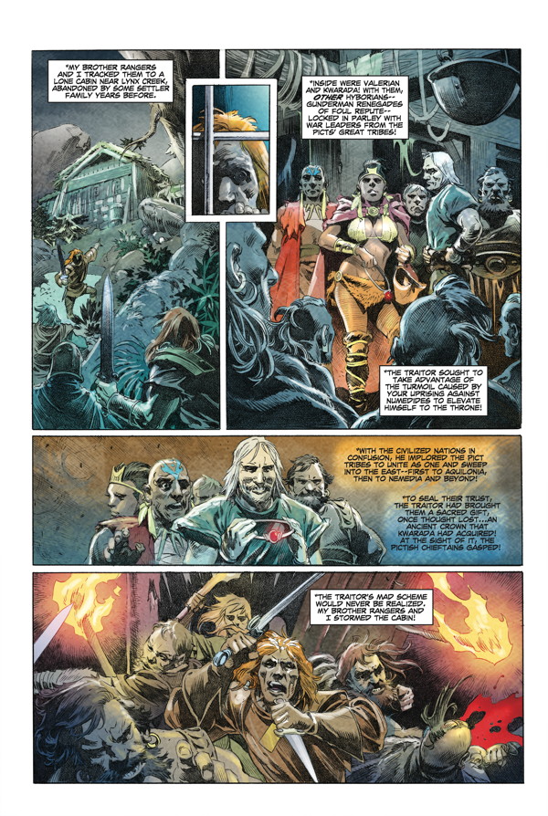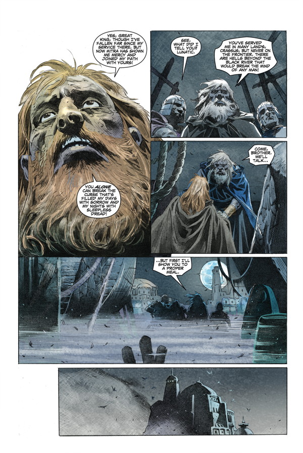 King Conan grows weary of the crown. When an old soldier visits him with talk of a cursed relic and rumors of Pictish tribes preparing a full-scale invasion on Aquilonia’s borders, Conan eagerly embarks on what could be his final adventure! A fan-favorite team expands on Robert E. Howard’s unfinished “Wolves beyond the Border” tale!