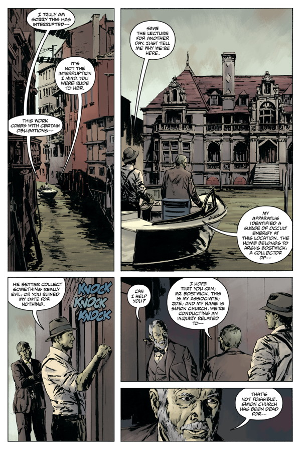 A search for the source of a signal picked up on Simon Church’s paranormal detector leads Church and Joe Golem to a mansion in submerged Greenwich Village, where a millionaire is going to supernatural lengths to recover what the Drowning City has taken from him.