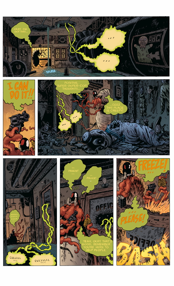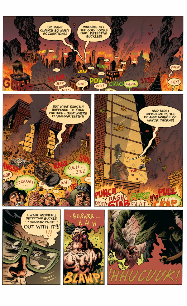 As Brick City goes to hell, Detective Buckle and his Lovecraftian monster sidekick Vinegar Teeth try to solve what's turning all the citizens into deadly zombies in the penultimate issue of this bizarre horror comedy!