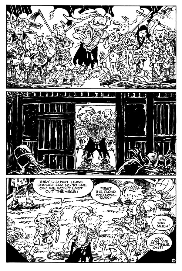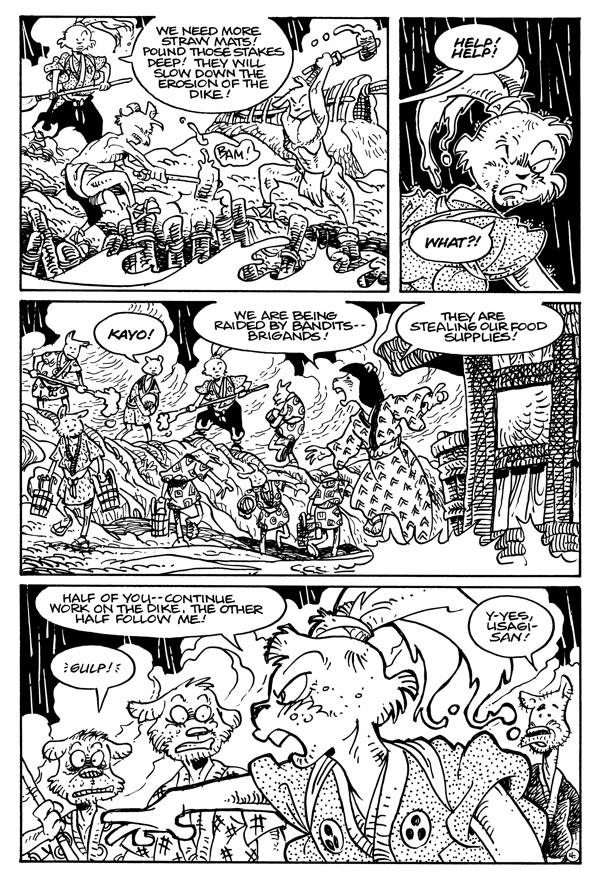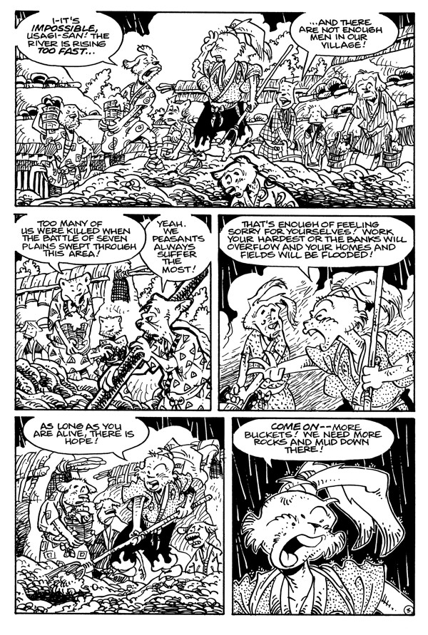Usagi’s travels take him to a village plagued by rainstorms threatening to destroy it. While the rabbit ronin organizes the men to build a levee, the defenseless town is ransacked by bandits. Now Usagi and his companions must choose: chase after the brigands and risk a flood or finish the dike and face starvation!