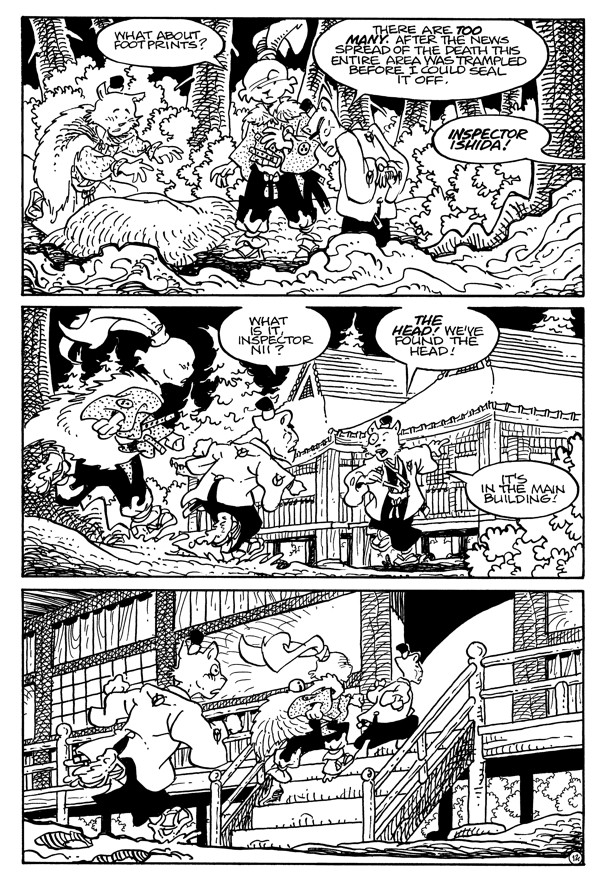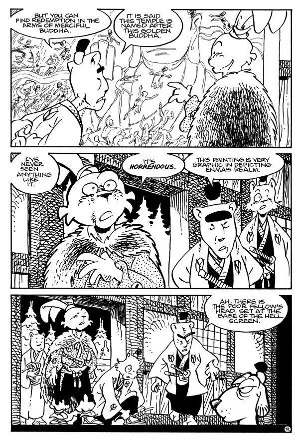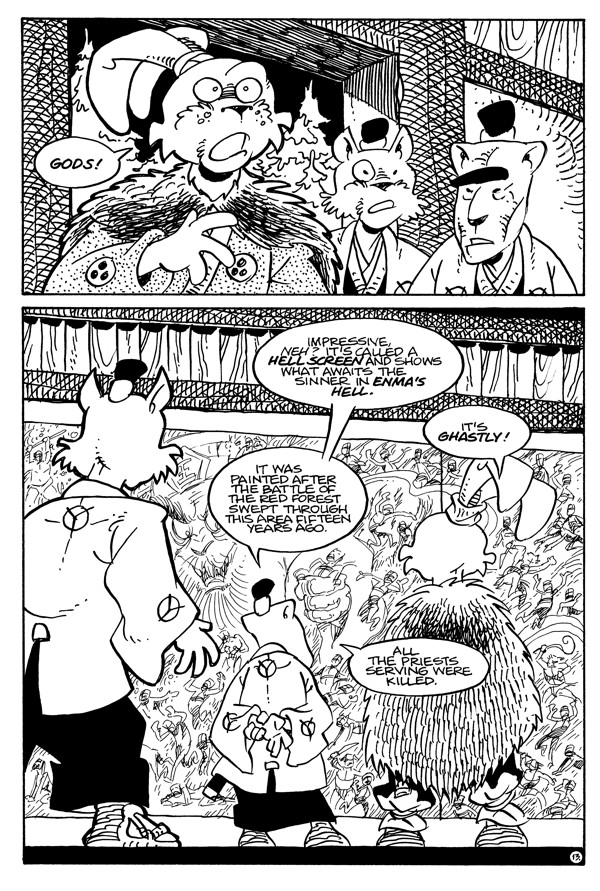 The rabbit ronin arrives at an isolated temple and is surprised to find none other than the virtuous Inspector Ishida, investigating a brutal murder! Their only clue is a mysterious, massive, and potentially sentient painting depicting the torments of Hell. Legend has it that this, the hell Screen, will seek vengeance on any who displease it! What will happen when Usagi and Inspector Ishida attempt to solve the murder?