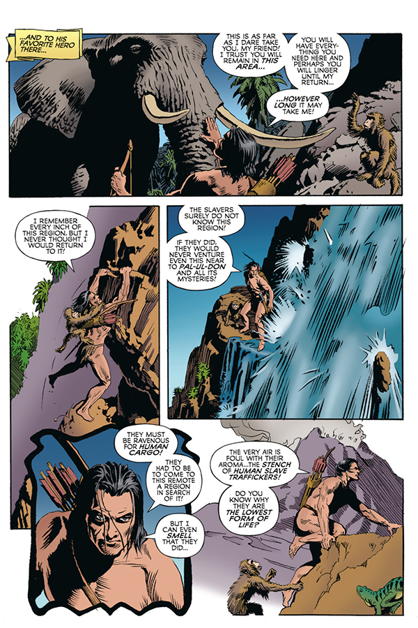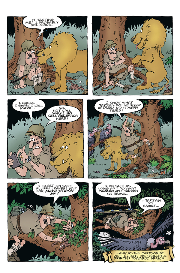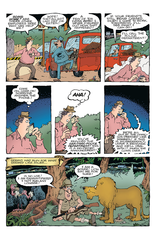A bumbling barbarian encounters the cunning lord of the jungle, but will Groo wind up destroying the jungle itself or teaming up with Tarzan to fight slavers? With cartoonist Sergio lost and running from hungry lions in Chula Vista's Jungle Safari Land and script writer Mark doing panels all day at Comic-Con, how will this comic get finished in time? Legendary Tarzan artist Thomas Yeates swings in to help! Plus--the Rufferto backup strips continue!