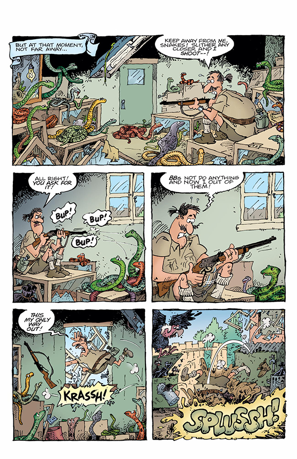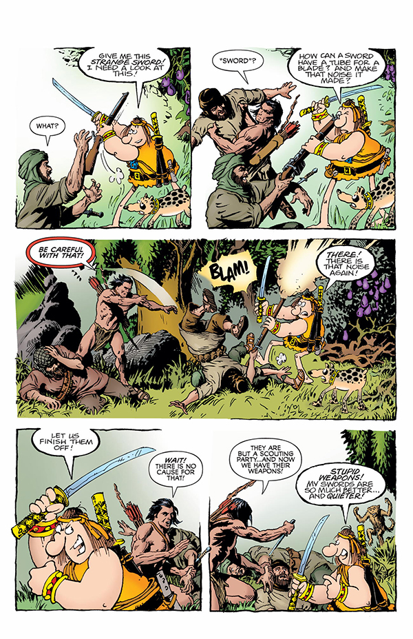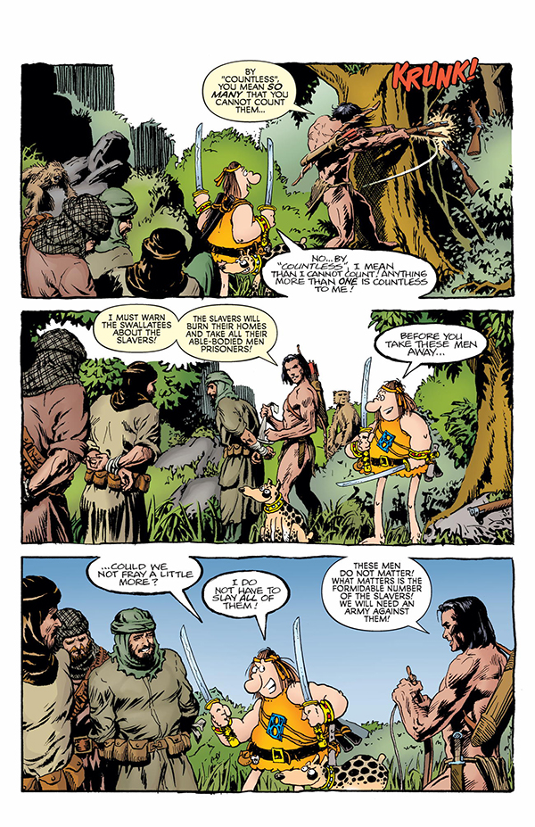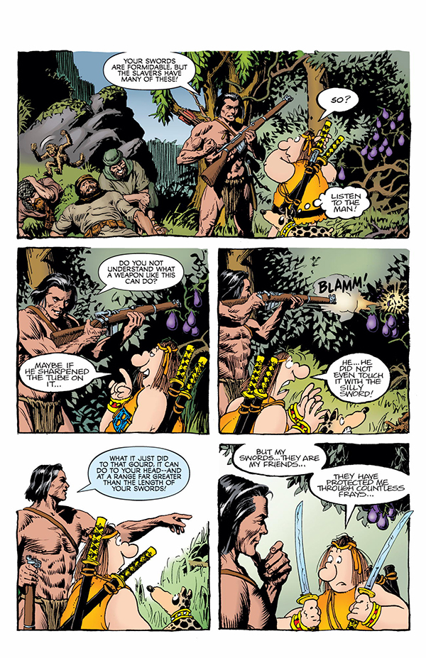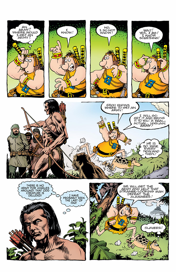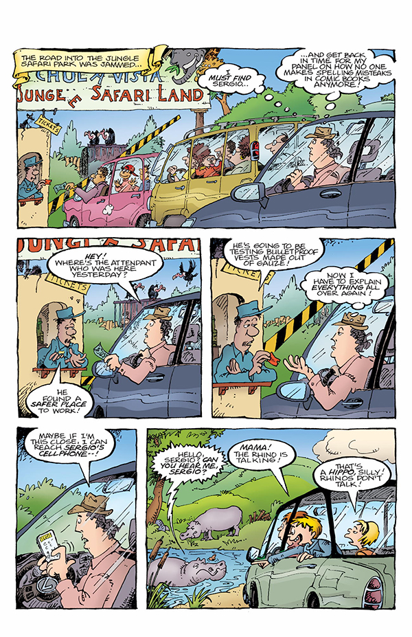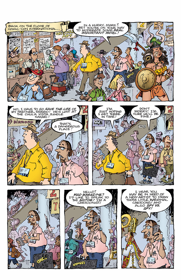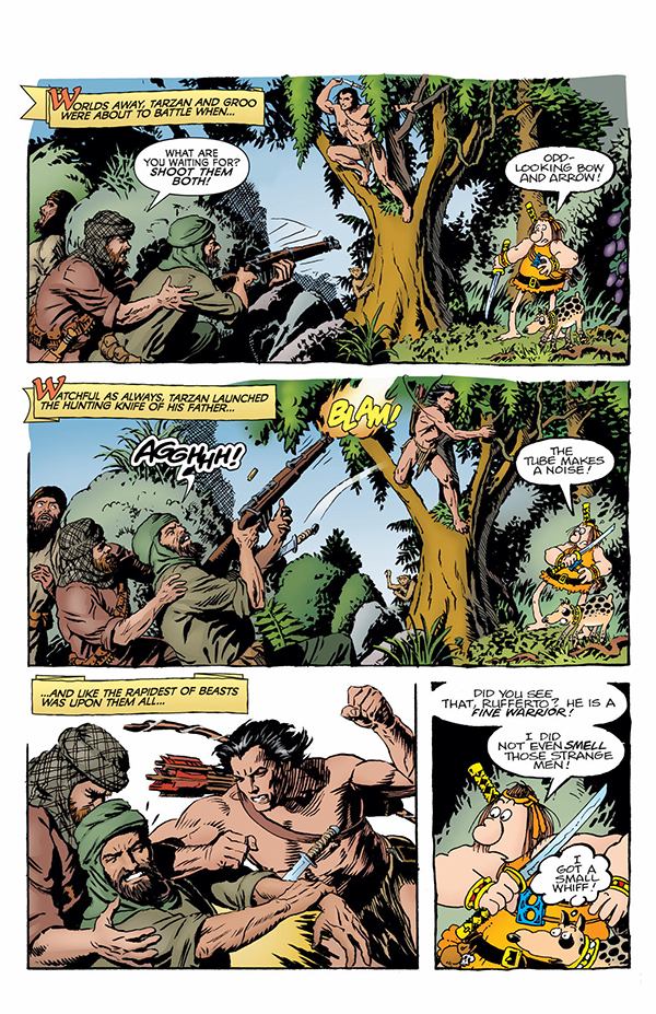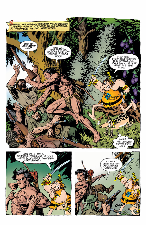 As Mark navigates through the dangers of Comic-Con International, Sergio--still lost in the Chula Vista Safari Jungle Land--meets snakes, vultures, and more lions! Meanwhile, Groo decides to help Tarzan defeat the slavers he's been tracking--if only Tarzan knew Groo's potential for disaster. Tarzan artist Thomas Yeates jams with Sergio Aragones! Also--Rufferto the dog continues to entertain in his marvelous backup strips!