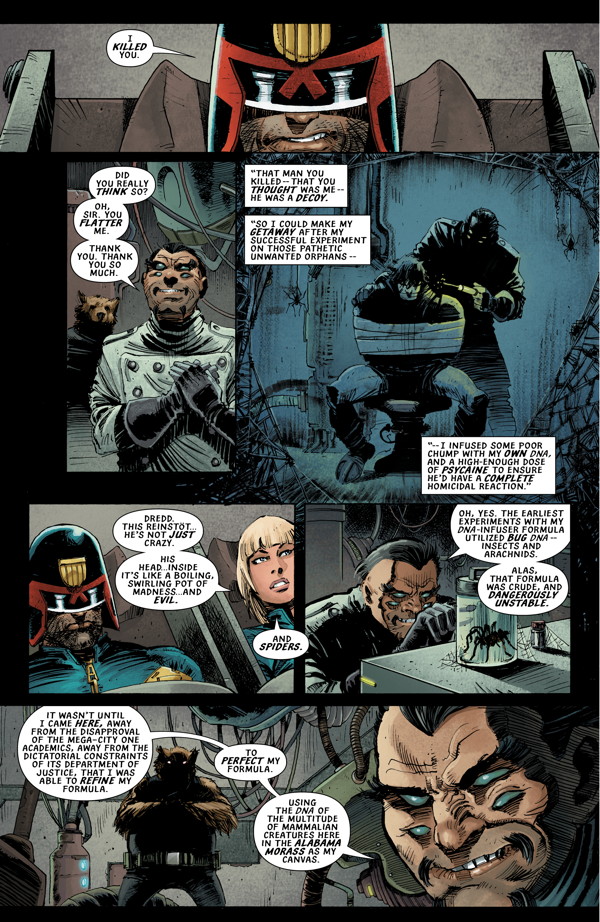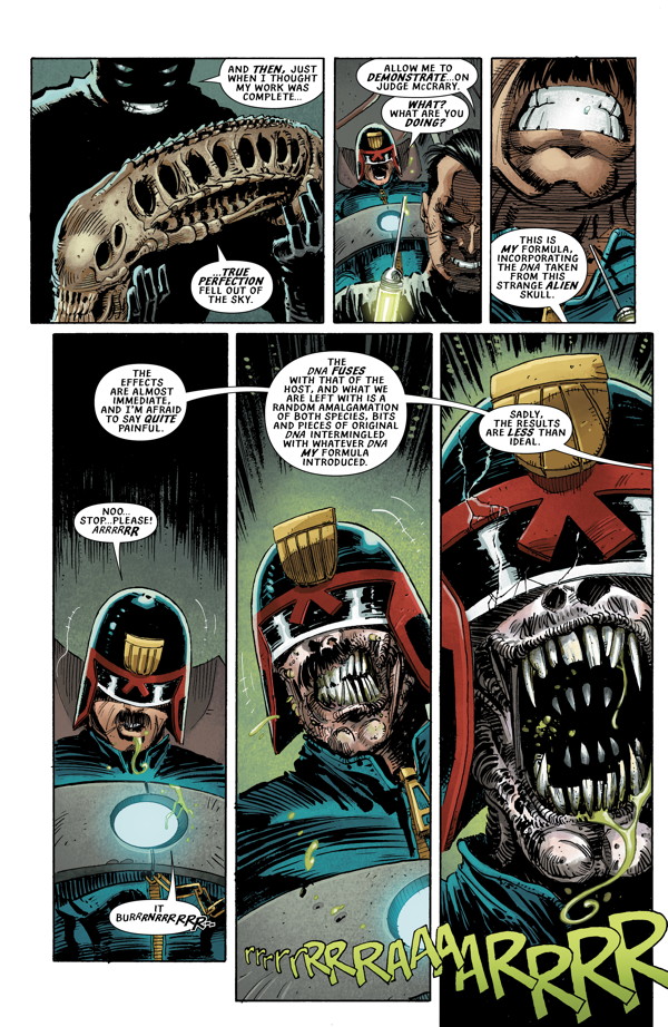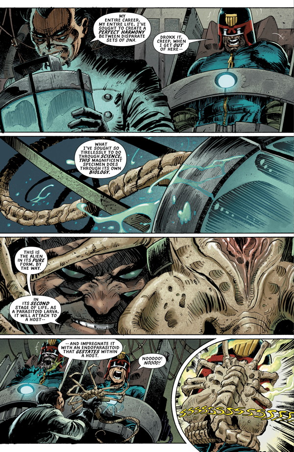 Want to make apocalypse stew? Throw in four Judges, one insane genetic scientist, a smattering of emoji-based cultists, a dash of Predator, and a pinch of essence of xenomorph, mix, and retreat to the nearest bunker. In this issue, Dredd follows a criminal cult leader into the Alabama Morass. A crew of Predators arrives on Earth to rescue a kidnapped comrade. And they both unwittingly wander into the territory of a revenge-obsessed, gene-splicing scientist who’s just gotten his hands on a xenomorph skull—and the universe’s deadliest DNA!