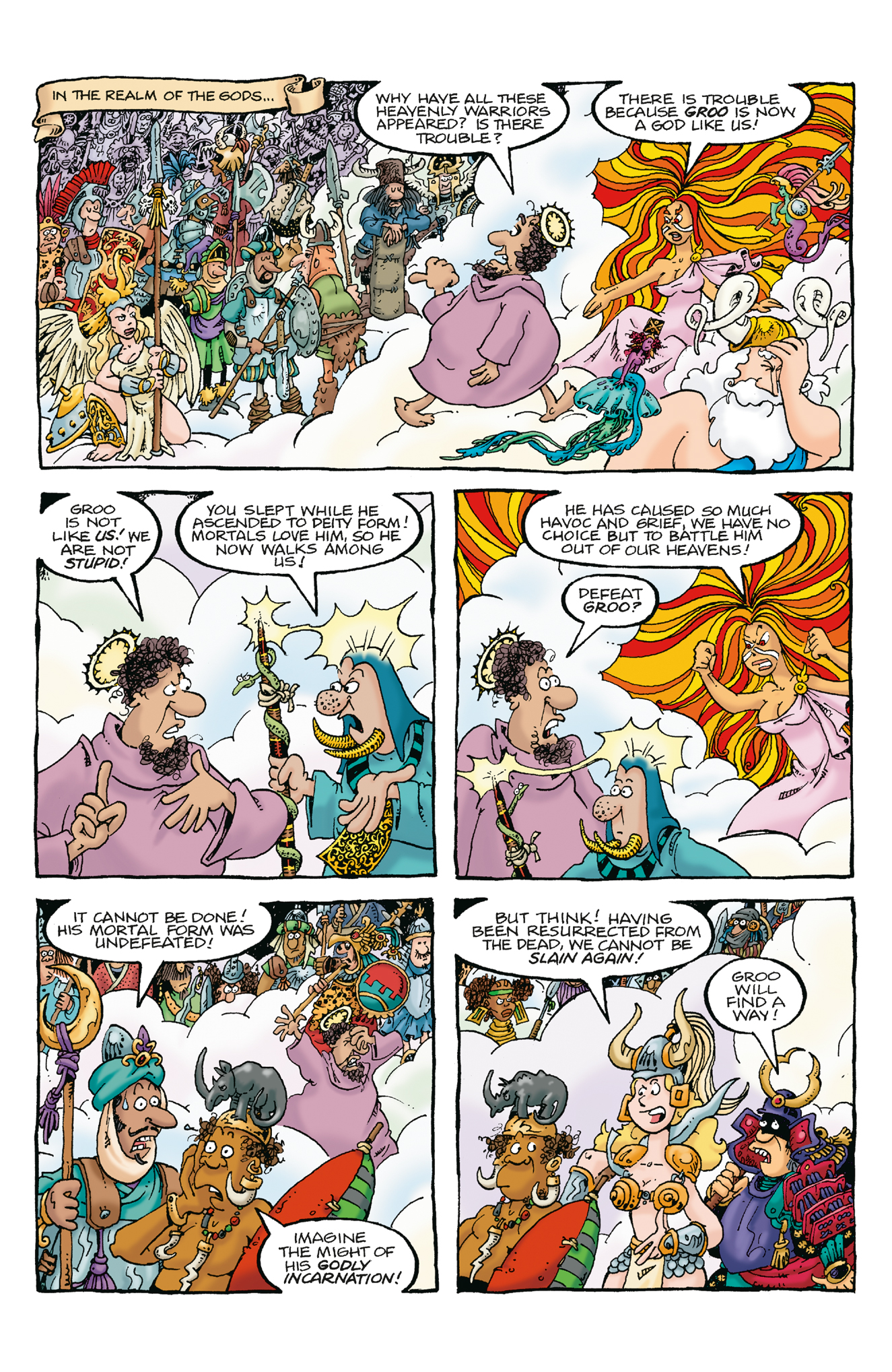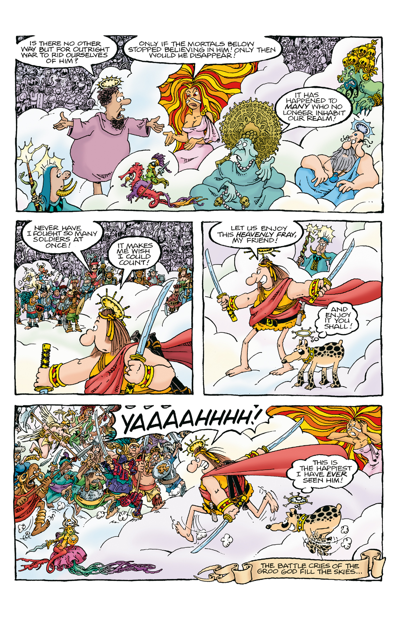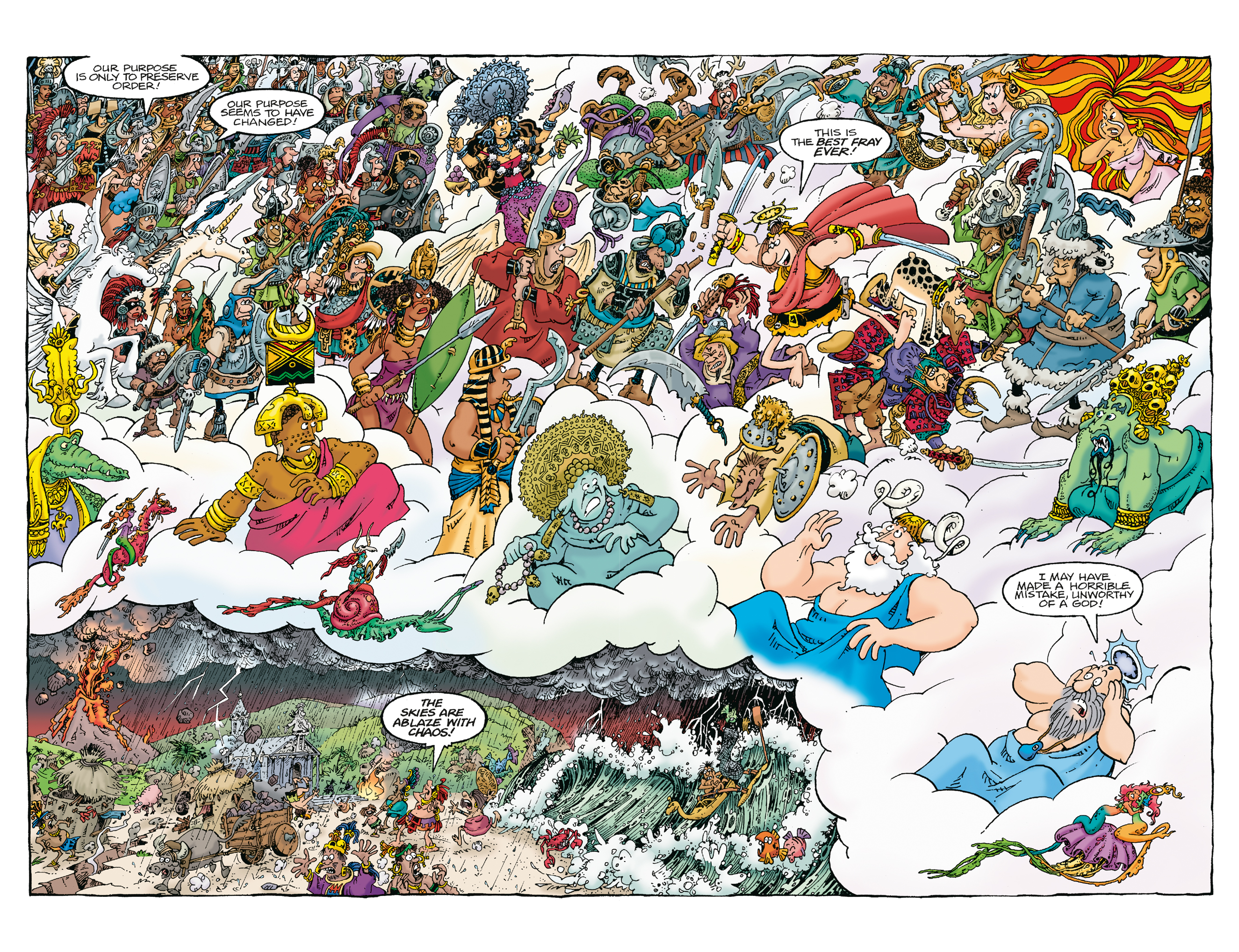 When a Groo-like deity arises in the heavens, scores of both well-known and obscure gods come together to end the havoc and destruction it's causing in their realm. While Earthbound Groo is alternately worshipped and hunted, his Divine Groo alter ego unleashes otherworldly chaos! Plus, another impeccable back cover Rufferto strip!