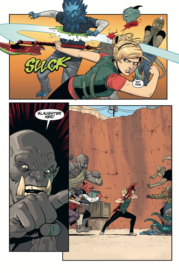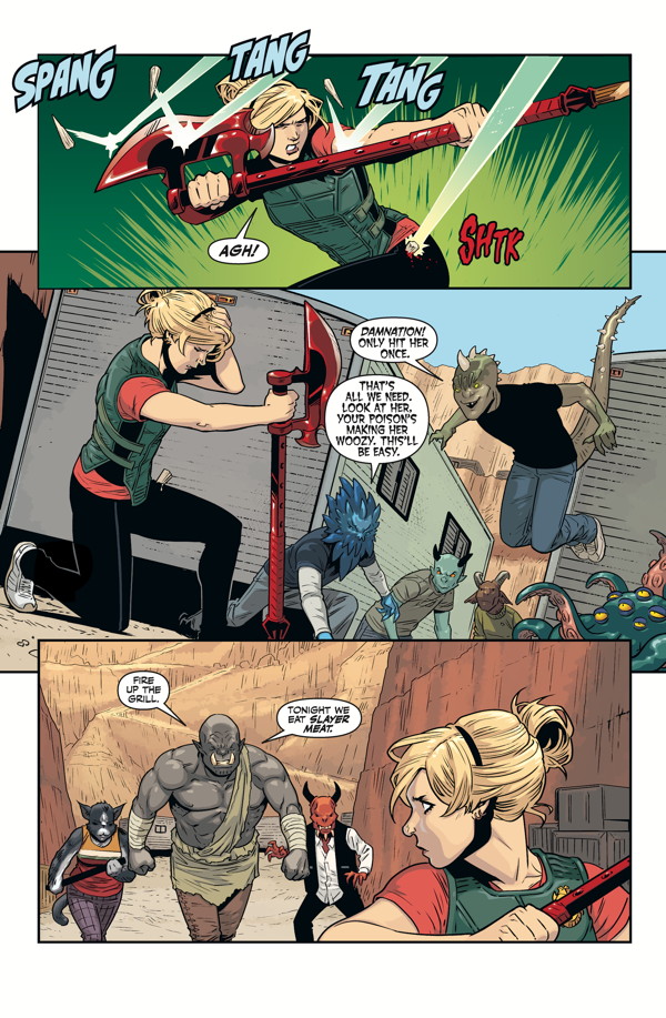 Life in the Safe Zone internment camp is not improving, and Buffy’s status as a peacekeeper has made her a target of the other inmates—but just what are they afraid she might do? Perhaps discover something more sinister going on within the Safe Zone’s impenetrable walls? Stakes are raised in Season 11!