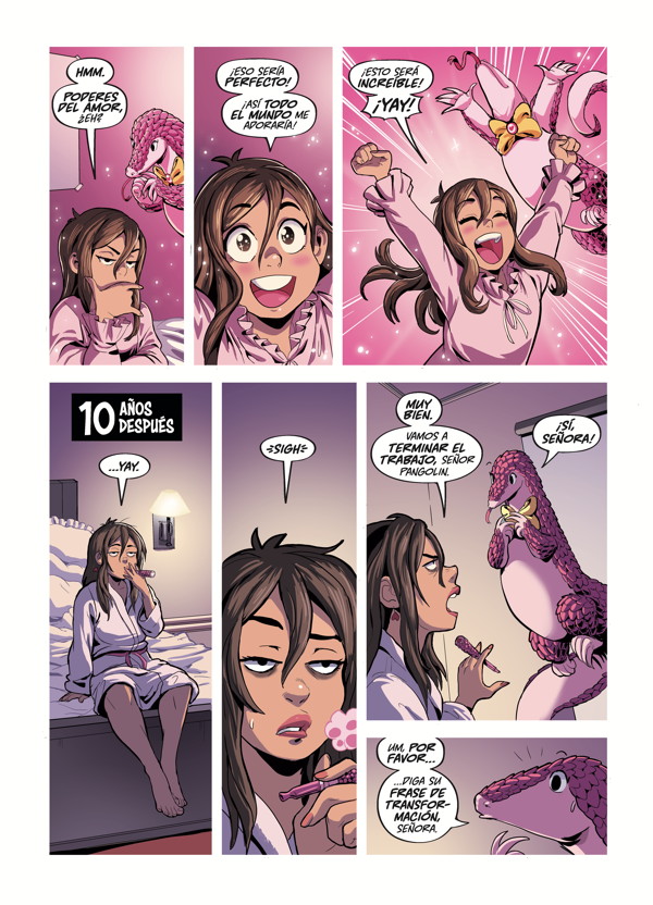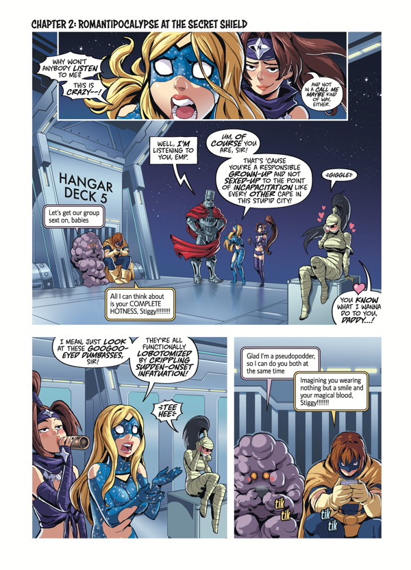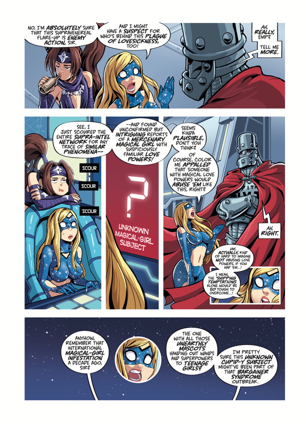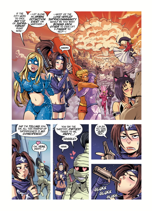 While Empowered struggles with a superhero community turned upside down by rampant romance, her mercenary “magical girl” opponent, the Soldier of Love, escalates her fanatical “down with love” campaign to an apocalyptic new level! Meanwhile, Ninjette wisely stays well hydrated with a beer or three! Or four! (Gotta have priorities, folks.)