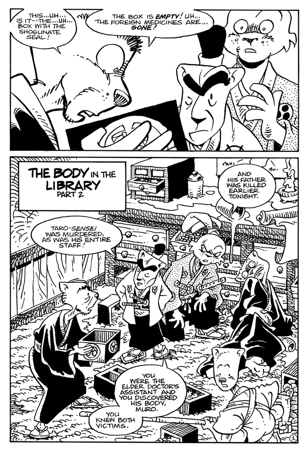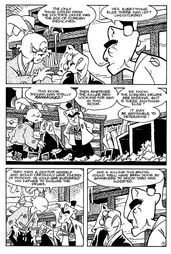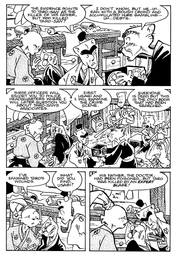 The search for the killer of the body in the library continues! While all evidence points toward one suspect, Usagi is still unsure, and he decides to keep digging. With help from some colorful friends, Usagi uncovers the shocking truth. Will he get to the culprit in time--or will Usagi suffer the same fate as the poisoned doctor?