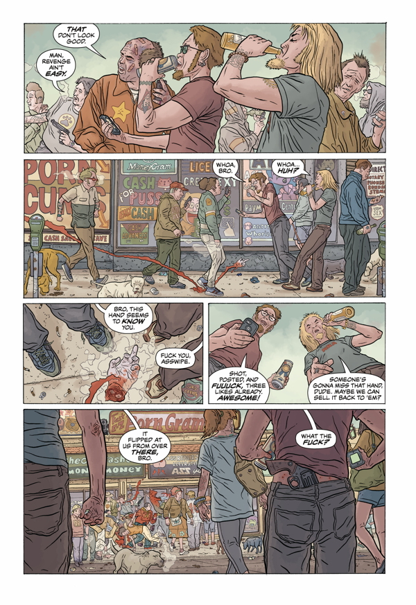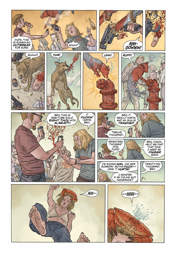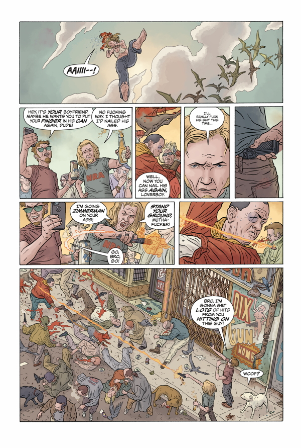 Bullets, claws, and fists fly when the evil congress of King Crab and the Revengers play their final trump card and attempt to pass a ban on the Shaolin Cowboy, who filibusters heads in the most dogged way possible. Who has the stronger constitution? Find out in issue #4!!!!!!