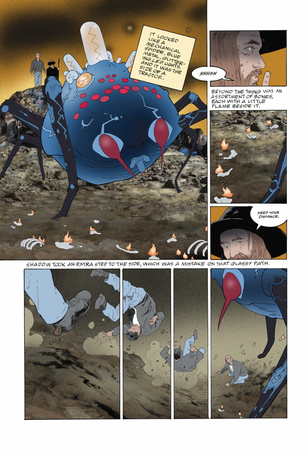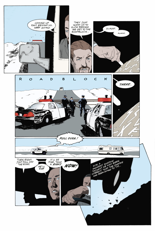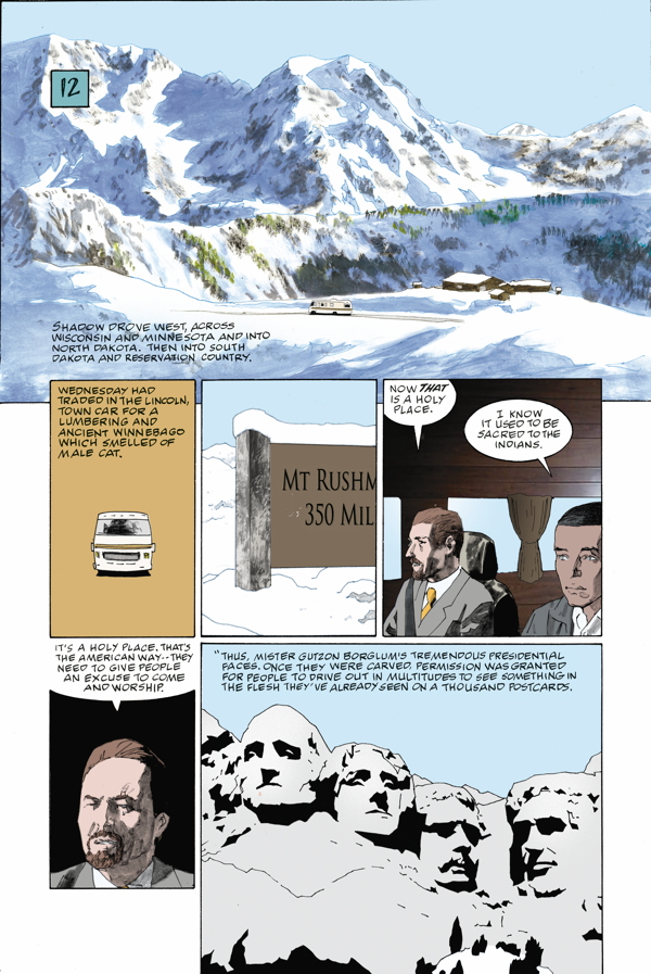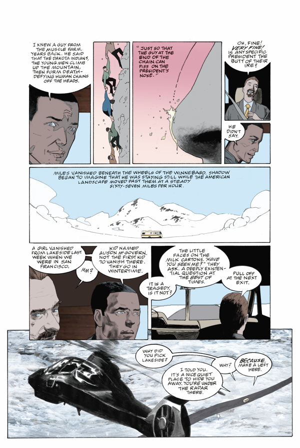 Shadow and Wednesday find themselves on the run from both the police and the mysterious Mr. Town. Along the way, they find help in their evasion from Whiskey Jack and John Chapman, all while Shadow continues to try to sort through the chaos in his life.
