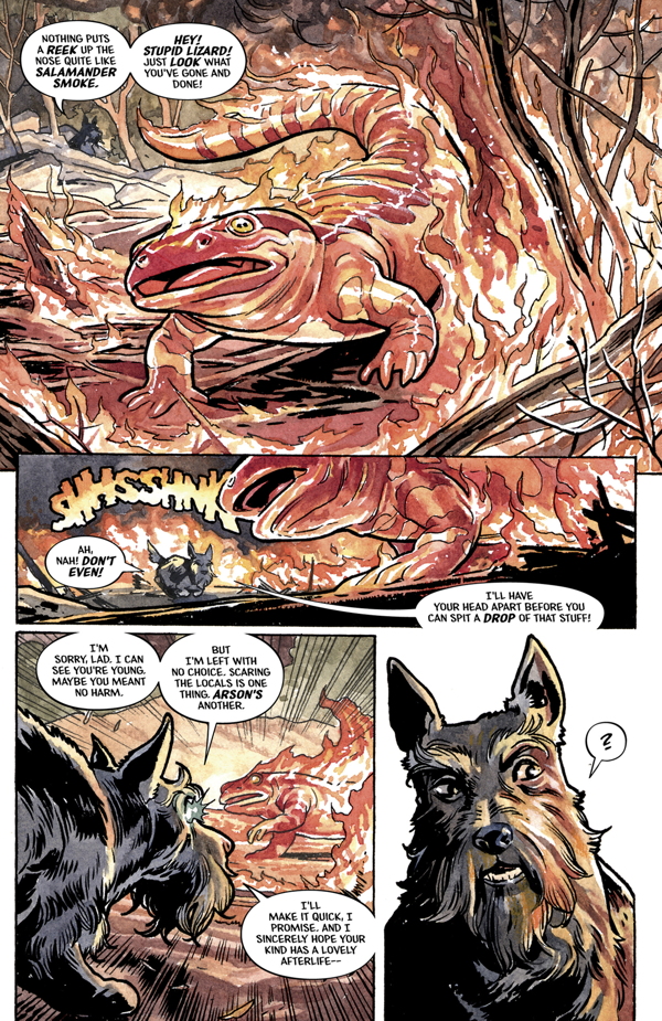 A heroic pack of canines known as the Wise Dogs set off on a mission to clean up a Pennsylvania corridor plagued by seemingly unrelated occult disturbances that include a fire salamander and a horde of mutant lurkers. A link is found among the various disturbances, leading our heroes to a mountain village inhabited by a survivalist witch-cult who have discovered the existence of a ''Blood Lure'' attracting occult forces, creatures, and many more terrors to Burden Hill!