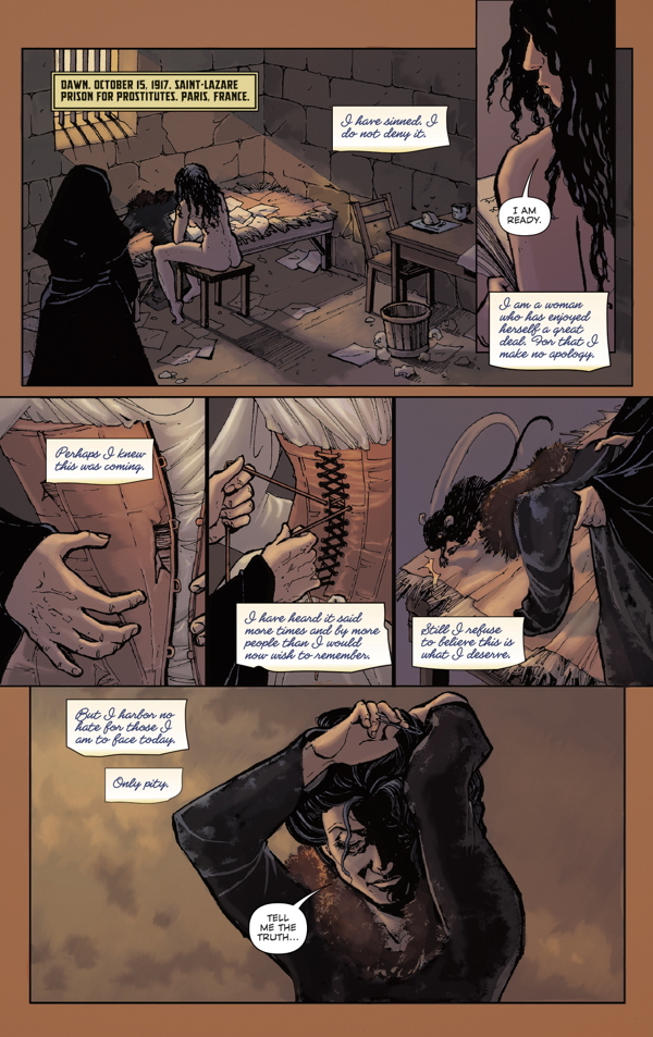 In this first part of a five-issue miniseries, we meet Mata Hari in prison at the end of her life as she writes her memoir--part romantic tale of a Javanese princess who performed ''sacred'' nude dances for Europe's elite, and part real-life saga of a disgraced wife and mother, who had everything she loved taken from her.