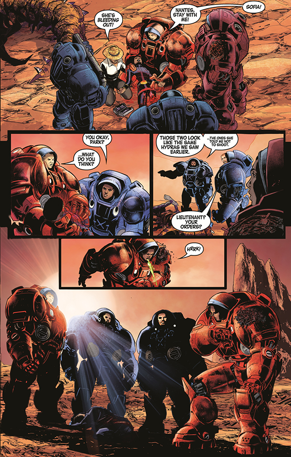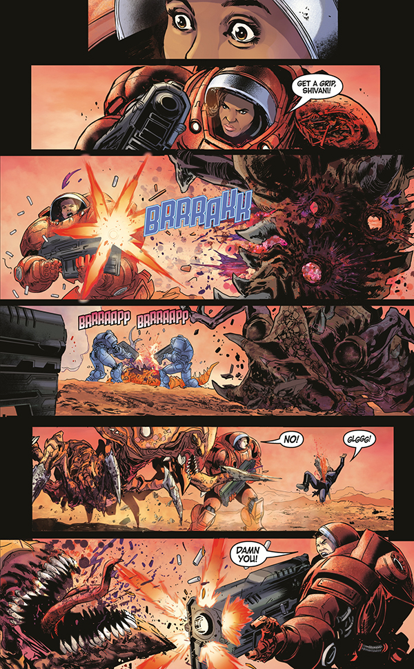 Lieutenant Shivani Singh confronts the realities of the frontier in the second issue of Blizzard Entertainment and Dark Horse's StarCraft: Soldiers. After a routine patrol ends in tragedy, Singh launches an investigation to root out threats to the fragile peace between the Dominion and the zerg swarm.