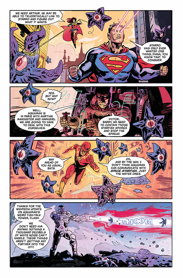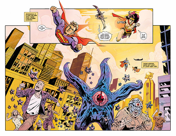 A strange man arrives simultaneously on Black Hammer Farm and in Metropolis, and both worlds are warped as Starro attacks! Batman, Green Lantern, Flash, Wonder Woman, Superman, and more crossover with Golden Gail, Colonel Weird, and the rest of the Black Hammer gang!